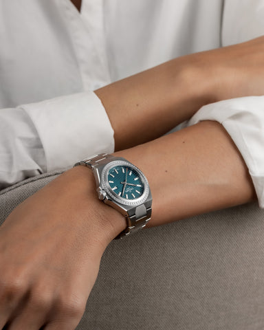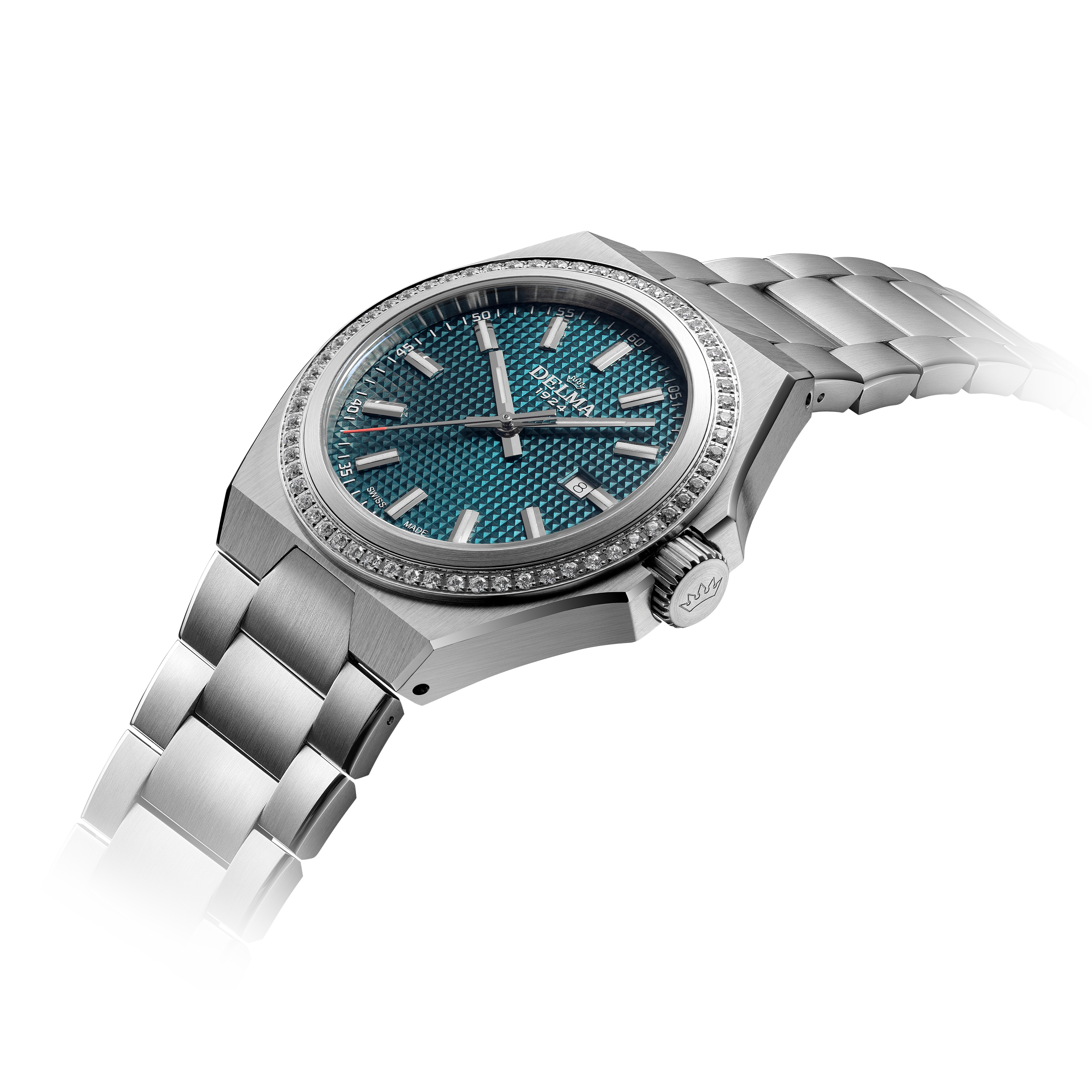 Meeting the demands of the modern wearer, DELMA's Midland Collection is inspired by a look back in time with bold geometric shapes incorporating a new integrated bracelet. Midland was one of the initial four brands used by DELMA’s founder in the 1920’s and also takes its namesake from a model in the 1980’s. Now available in a smaller version, the 34mm brushed stainless steel tonneau shaped case features a diamond encrusted polished fixed bezel. Teal blue guilloche pyramid pattern dial is surrounded by 60 genuine diamonds. Applied Super-LumiNova indices with date window @3 sit behind an anti-reflective sapphire crystal. Luminous baton shaped hands with red tipped central seconds are surrounded by a minutes track. Fitted with a polished and brushed integrated stainless steel 3-link bracelet with security fold-over push button deployment clasp to secure in place.
