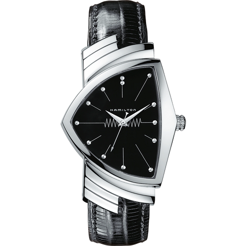 The Ventura Collection is one of Hamilton's most iconic and eclectic wrist watches since 1957. Known as the watch Elvis wore with its unusual triangular shape and unconventional design still has charm and enduring legacy today. The quartz model #H24411732 has a triangular 32.3mm polished stainless steel case with winged bezel and mineral crystal. The black dial has a silver zig-zag pattern across the face with polished sword style hands surrounded by circular stick markers. Finished with a black leather lizard grained calf-skin strap with matching stitch signed with stainless steel tang pin buckle with Hamilton emblem.