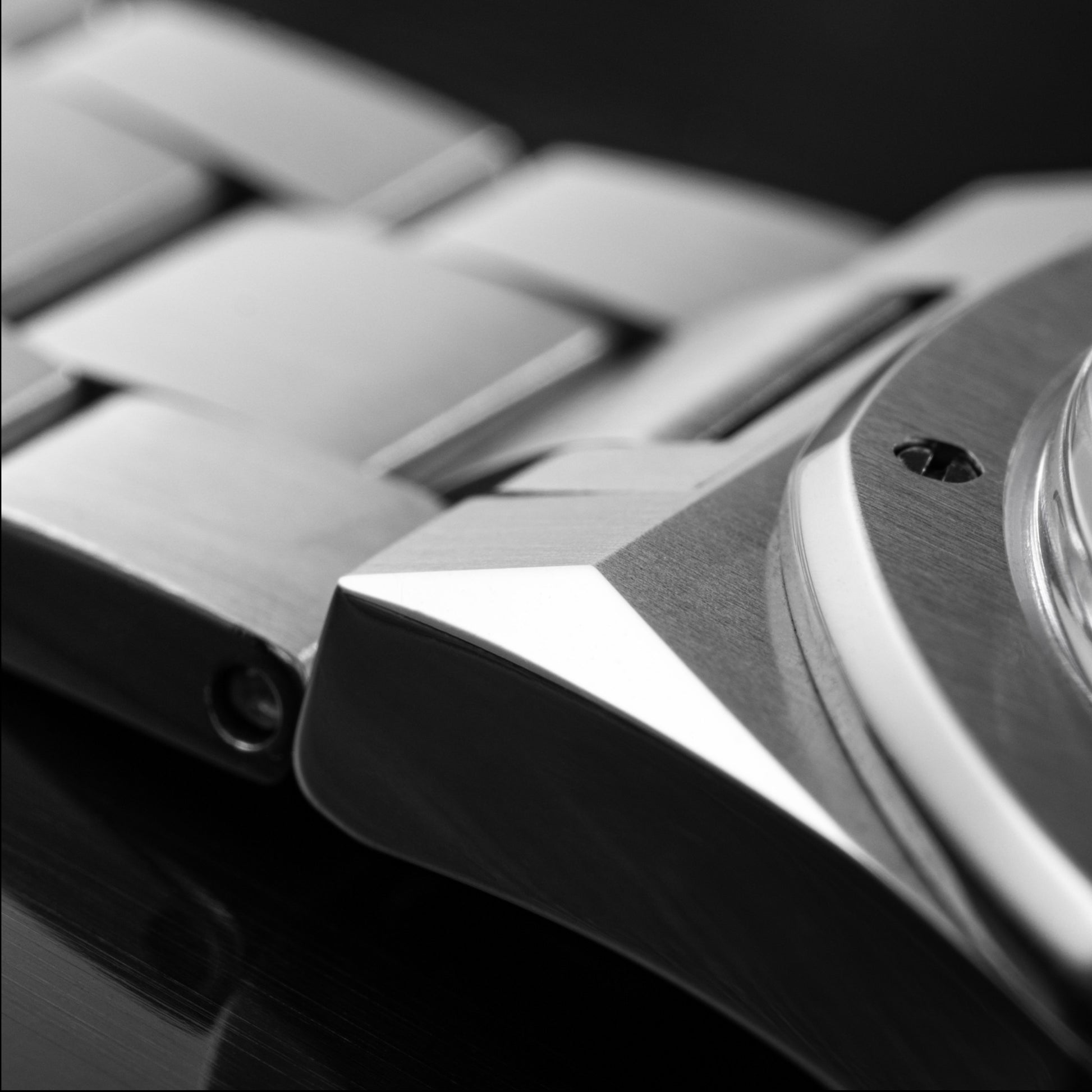 • Brushed  with polished sides fixed octagon bezel with 8 screw-pin detail accents