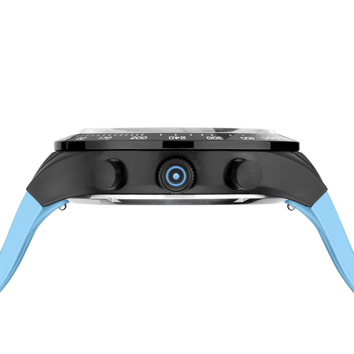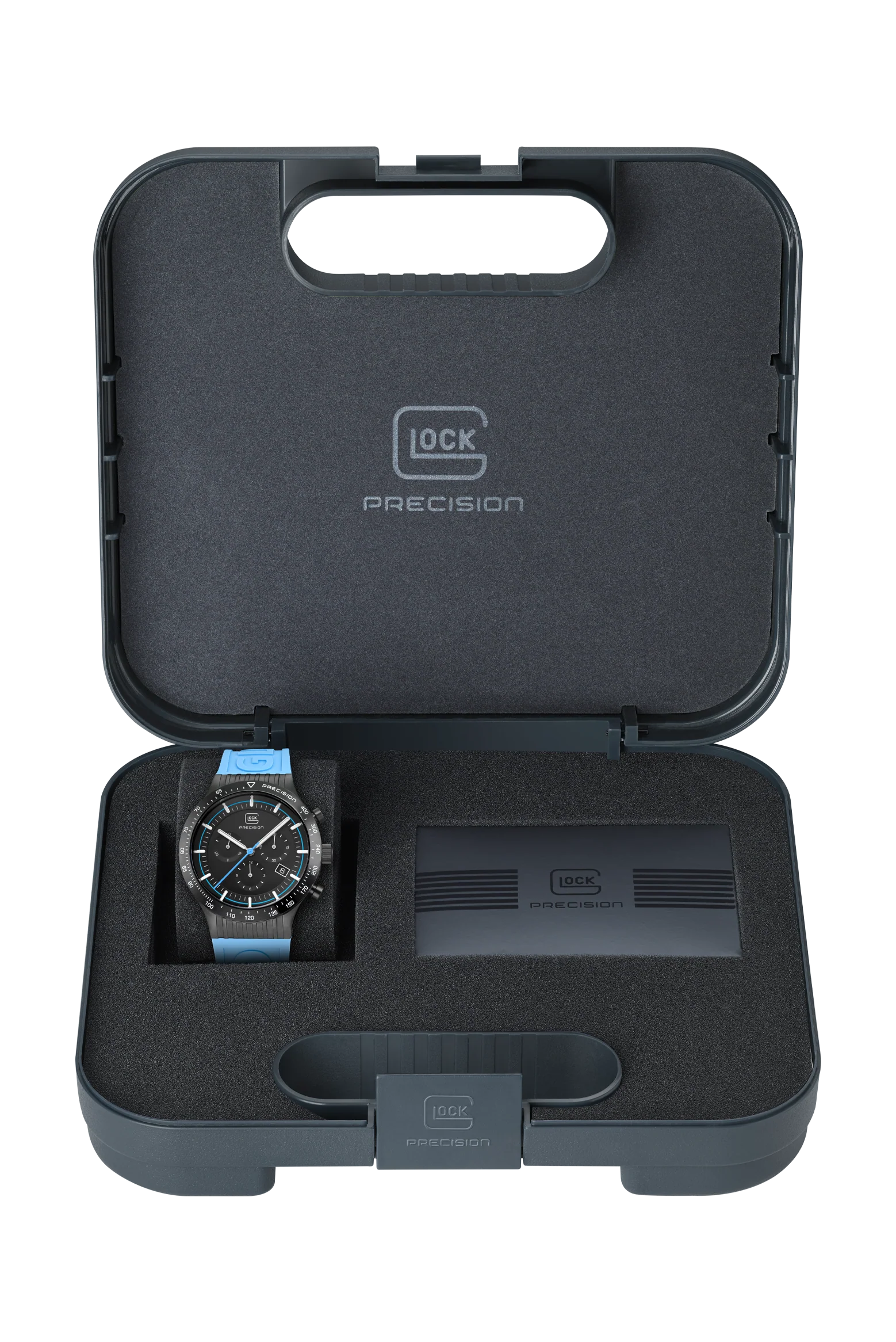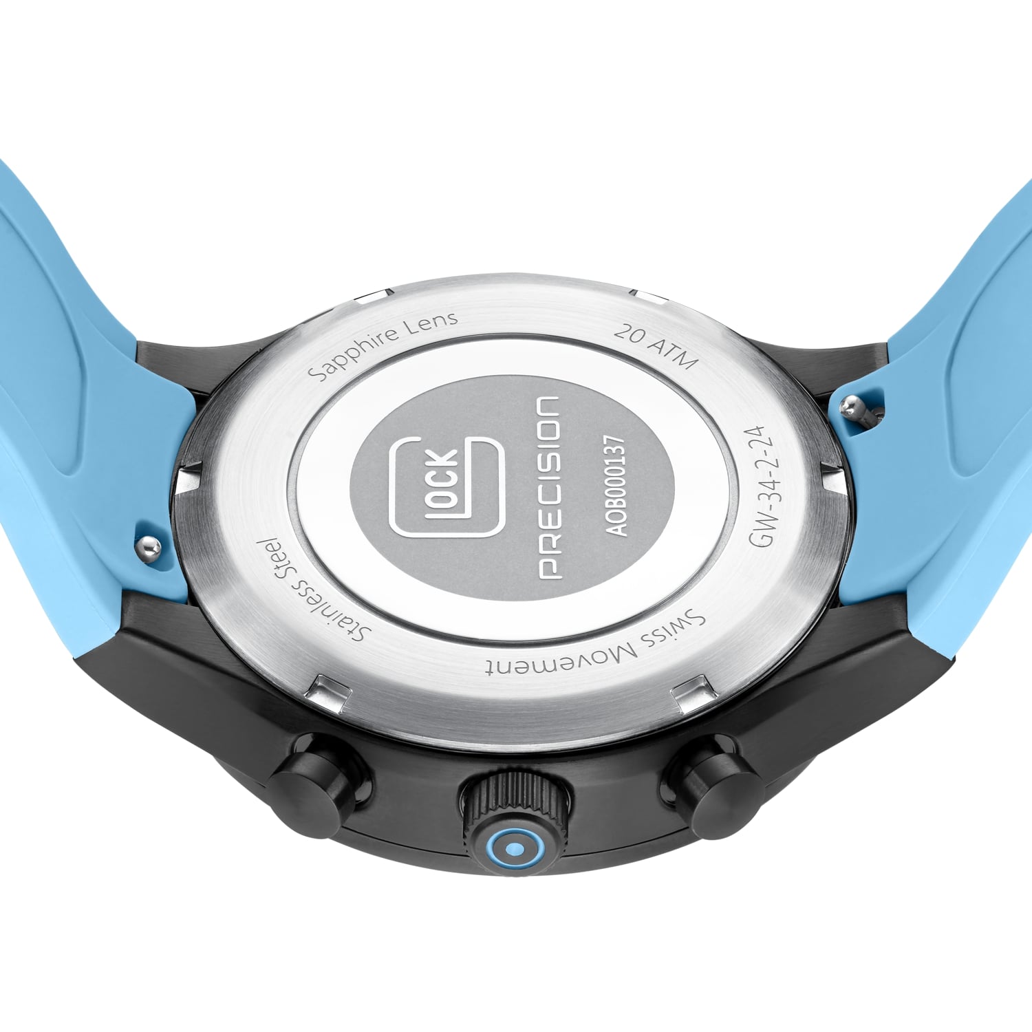 The GLOCK Chronograph Quartz Model: GW-34-2-24 features a black tachymeter bezel for speed measurement surrounded by a brushed black PVD coated 43mm steel case with contoured ridged lugs. The black satin dial has luminous silver indices and pencil shaped hands with minutes track behind a scratch resistant sapphire crystal. Equipped with a sub-seconds, 30-minute, and 12-hour counter with slanted date window @4 for precision timing. The screw down crown has GLOCK cartridge primer image etched in blue between brushed PVD coated steel chronograph pushers. Fitted with a turquoise blue rubber silicone strap with raised GLOCK lettering and black steel PVD coated pressed bi-fold deployant clasp to secure in place.