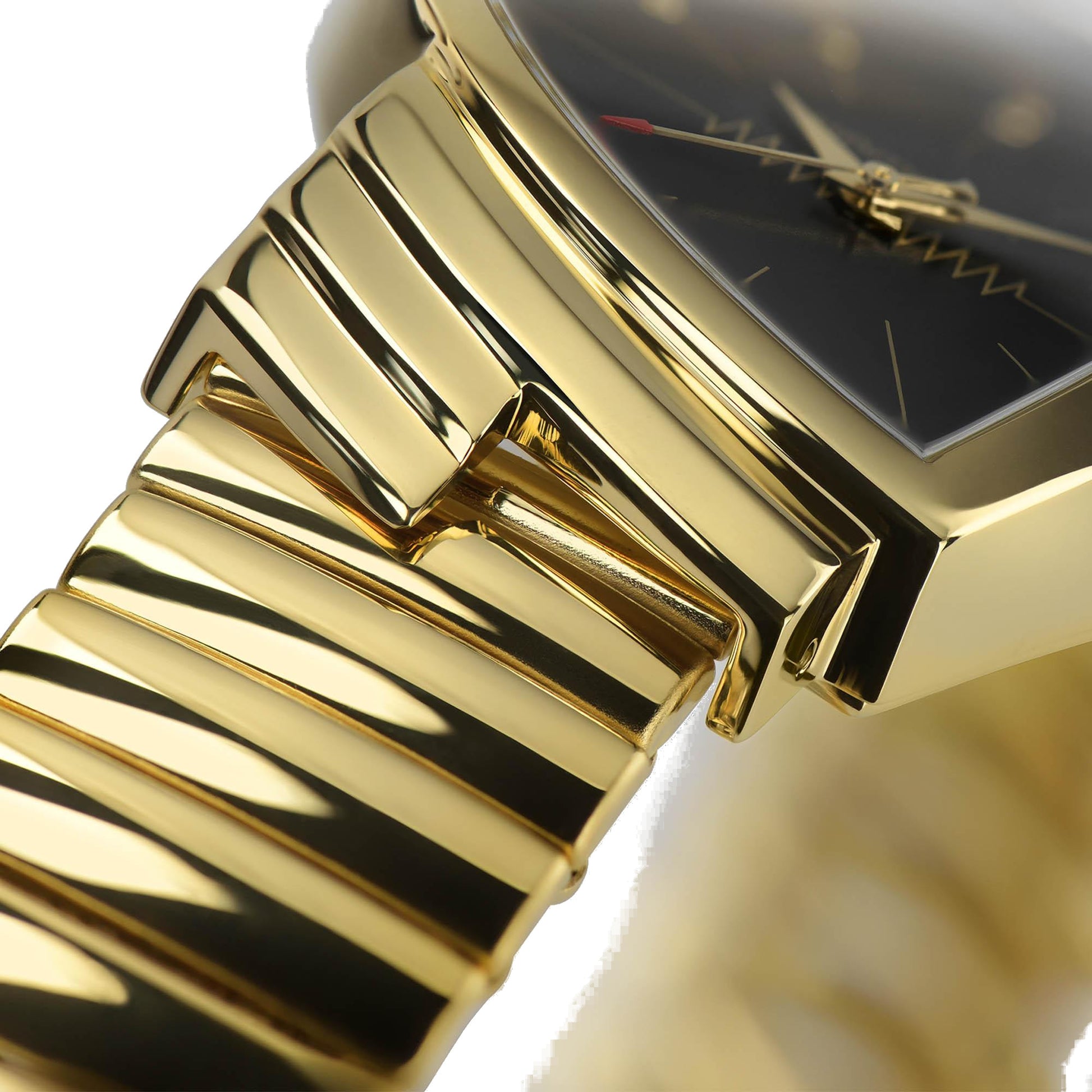 Case Material Polished gold-tone PVD coated stainless steel case with fixed triangle shaped winged bezel