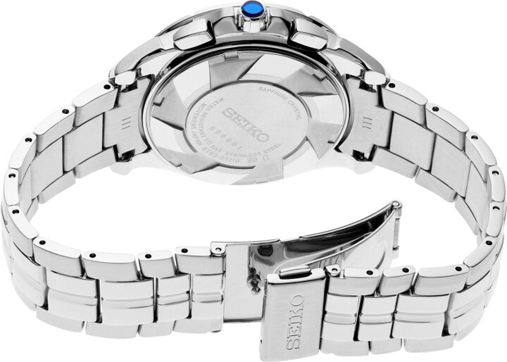 The Coutura Collection from SEIKO is a diverse timepiece with the looks of a dress watch and practical functionality of a sports piece. Inspired by motor sports racing, the new case and bracelet design incorporates angles and edges reminiscent of a racecar. The SSB431 quartz chronograph measures up to 60 minutes in 1/5-second increments with a split time measurement function and stopwatch. The polished stainless steel 42mm case has a blue carbon fiber patterned dial with grooved blue accented bezel. A screw down stainless steel cabochon crown with jewel insert is protected by a crown guard between polished chrono pushers. Luminous skeleton diamond shaped hands and markers with orange chrono hand are viewable behind a sapphire crystal. The chronograph features small seconds located centrally @6 with 24-hr sub-dial @3 and sub seconds @9. Powered by Seiko's own quartz caliber movement 8T63 with date function and 100 meter water resistance. The tapered polished and brushed chevron style stainless steel bracelet has a twin push button tri-fold safety clasp to keep your watch secure and in place.