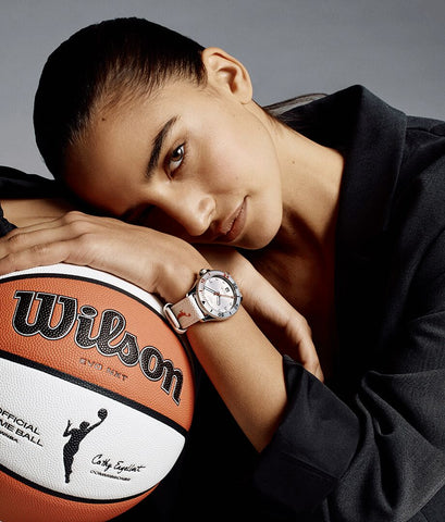In collaboration with the  (WNBA), the Tissot Watch Brand commemorates the team with a special edition model quartz #T120.410.17.011.00T wrist watch. As the Official Time Keeper of the WNBA, Tissot pays homage with the white and orange colors of the league using the official Wilson Basketball leather material in its strap components. Part of the Seastar 1000 Series, the 40mm polished and brushed stainless steel case has a uni-directional coin-edge diving bezel featuring the 24-second basketball shot clock time. Noted in its namesake, the Seastar 1000 has an impressive 1000 feet water resistance rating with screw-down crown set within a protective crown guard. The white circular sun brushed dial is easily viewable under a scratch resistant anti-reflective sapphire crystal. Applied luminous circular and stick markers are surrounded by a minutes track on outer dial. Equipped with luminous plongeur shaped diver hands with orange T topped seconds hand with date window @6. Finished with a textured pebble grained basketball leathers with embossed WNBA logo and image with brushed and polished stainless steel tang buckle with Tissot logo.