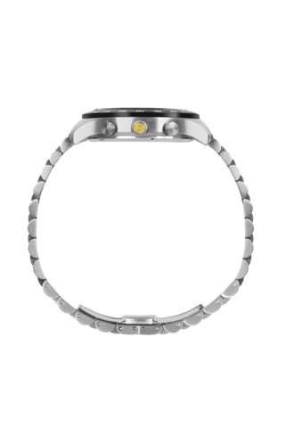 The GLOCK Chronograph Quartz Model: GW-35-1-22 features a black tachymeter bezel for speed measurement surrounded by a 46mm steel case with contoured ridged lugs. The black satin dial has luminous silver baton shaped hands with vivid yellow minutes and slanted date window for easy visibility behind a scratch resistant sapphire crystal. Equipped with a sub-seconds, 30-minute, and 12-hour counter with slanted date window @4 for precision timing. The screw down crown has GLOCK cartridge primer image etched in yellow between polished steel chronograph pushers. Fitted with a stainless steel 5-link bracelet with GLOCK logo twin push button pressed deployant clasp to secure in place.