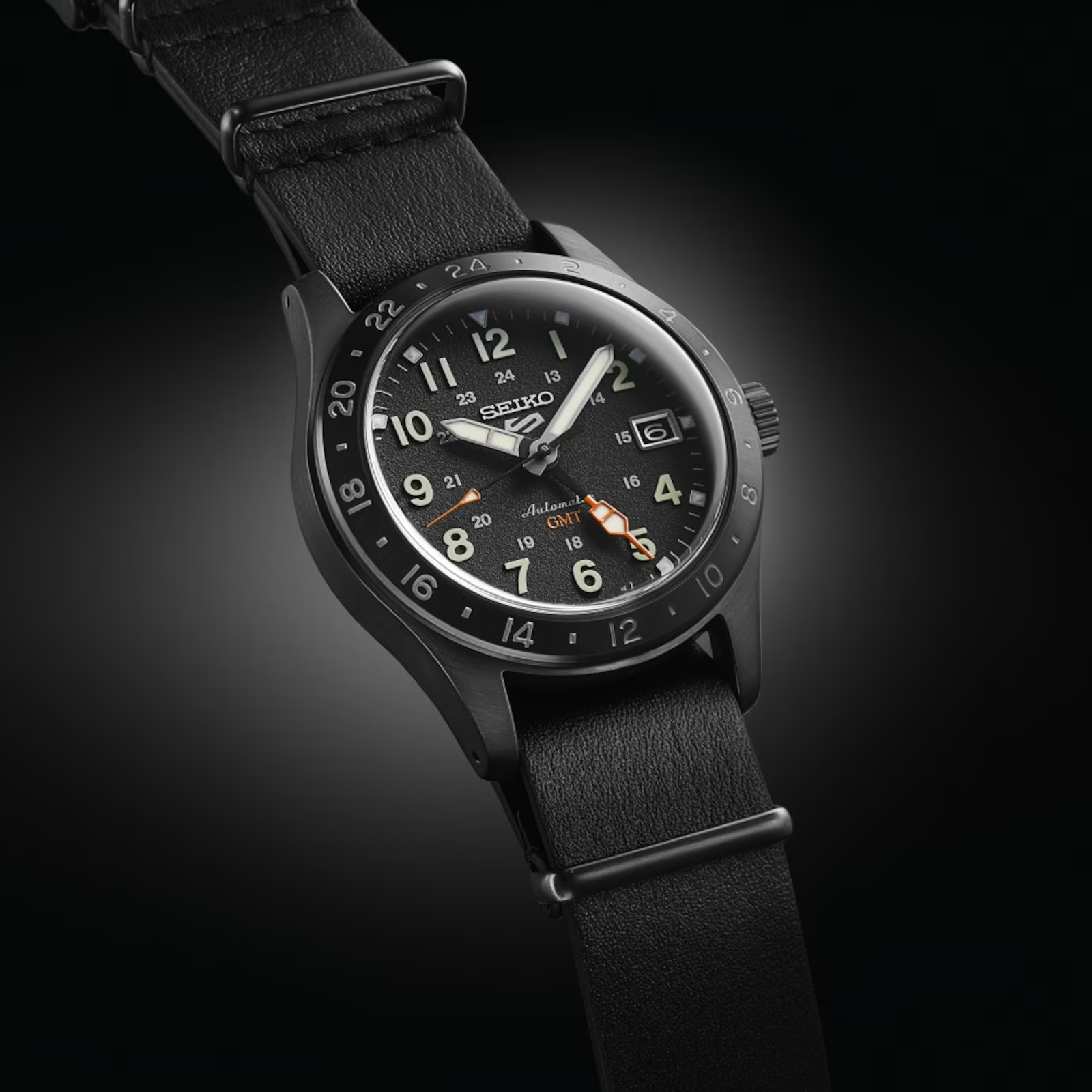 The NEW SEIKO 5 Sports Collection is inspired by the "trench" watch, these vintage military pieces were once worn in the field. Created to be robust, reliable and designed with all the characteristics known from the Seiko 5 Sports line with manual wind capacity and hack function for precision setting but now featuring a GMT function. The automatic 39.4mm brushed and polished black PVD coated stainless steel case has a black sandblasted dial with brushed 24 hour bezel behind a curved hardlex crystal. Equipped with both 12 and 24-hour military time with luminous Arabic numerals makes for easy readability at a glance. Luminous baton style hands with orange accented seconds and GMT hand is surrounded by a minutes track on outer dial. A date window is located @3 with push-pull easy-grip black PVD coated stainless steel crown with 100 meter water resistance capacity. Powered by Seiko's own in-house-made automatic caliber 4R34 movement viewable behind the exhibition case-back with 41 hour power reserve. Fitted with a black calf-skin leather vintage style NATO strap with brushed and polished black PVD coated tang buckle to secure in place on the wrist.