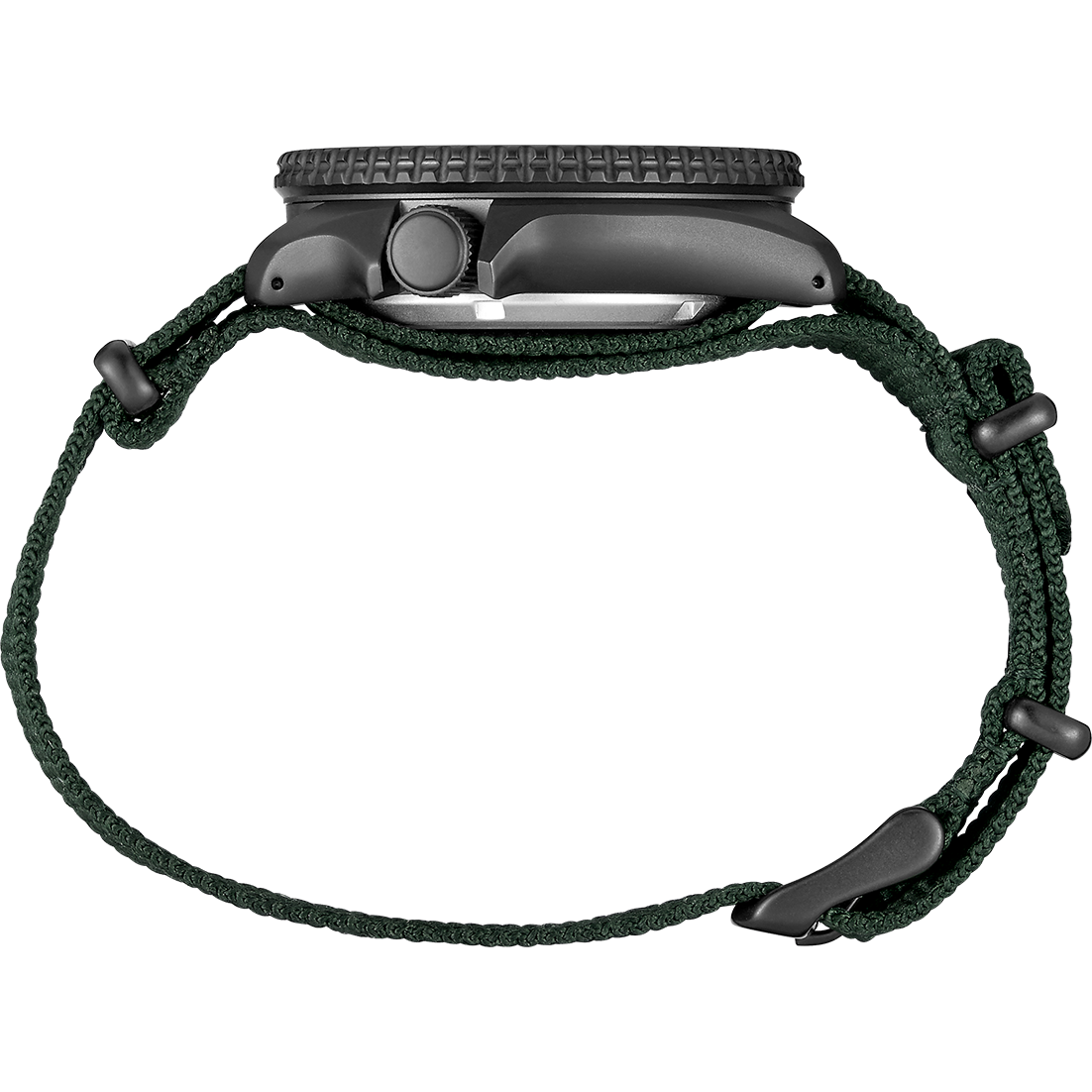 The SEIKO 5 Sports Collection is a true classic automatic timepiece and must have favorite staple for any true watch enthusiasts.  The SRPD91 automatic 42.5mm brushed and polished gunmetal stainless steel case has manual wind capacity with hack function for precision setting. The black sunray finished dial has matching black aluminum rotating uni-directional bezel with white accents. Equipped with a double day/date window @3 with minutes track on outer chapter ring and luminous arrow style hands and markers for easy legibility. Has 100 meter water resistance with a gunmetal stainless steel crown nestled between a crown guard strategically positioned at 4:00 for increased comfort. Powered by Seiko's own in-house-made automatic caliber 4R36 movement viewable behind the exhibition case-back with 41 hour power reserve. Fitted with a green nylon NATO style strap with stainless steel tang buckle to keep your watch secure and in place.