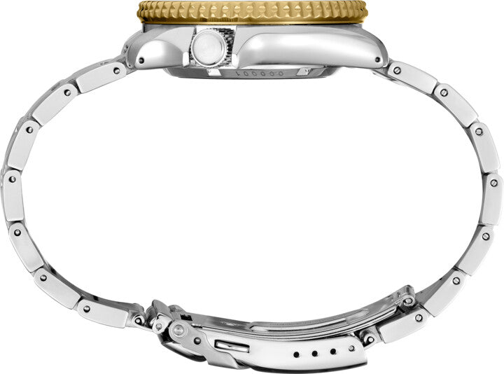 The SEIKO 5 Sports Collection is a true classic automatic timepiece and must have favorite staple for any true watch enthusiasts.  A U.S. Special creation, the SRPK22 automatic 42.5mm brushed and polished PVD coated stainless steel case has manual wind capacity with hack function for precision setting. The black matte dial is surrounded by a gold-tone PVD coated aluminum rotating uni-directional black bezel with gilded accents. Equipped with a double day/date window @3 with minutes track on outer chapter ring and luminous arrow style hands and markers for easy legibility. Equipped with a 100 meter water resistance rating with a stainless steel crown nestled between a crown guard strategically positioned at 4:00 for increased comfort. Powered by Seiko's own in-house-made automatic caliber 4R36 movement viewable behind the exhibition case-back with 41 hour power reserve. Fitted with a two-tone stainless steel brushed and polished 3-link bracelet with deployment butterfly safely clasp that's adjustable by 5 positions to keep your watch secure and in place.