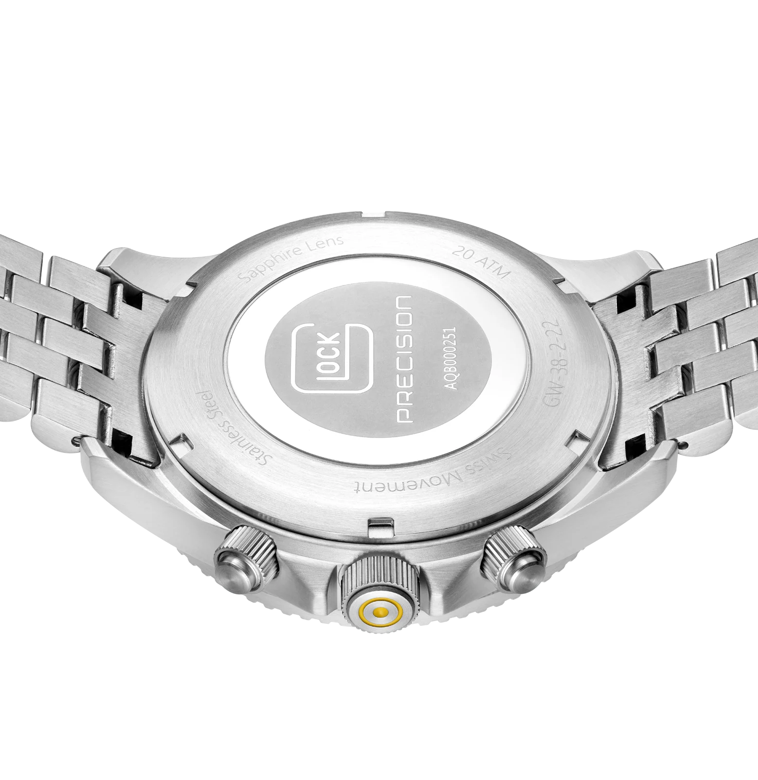 • Brushed stainless steel screw-down crown with etched yellow GLOCK cartridge primer image positioned between crown guards
