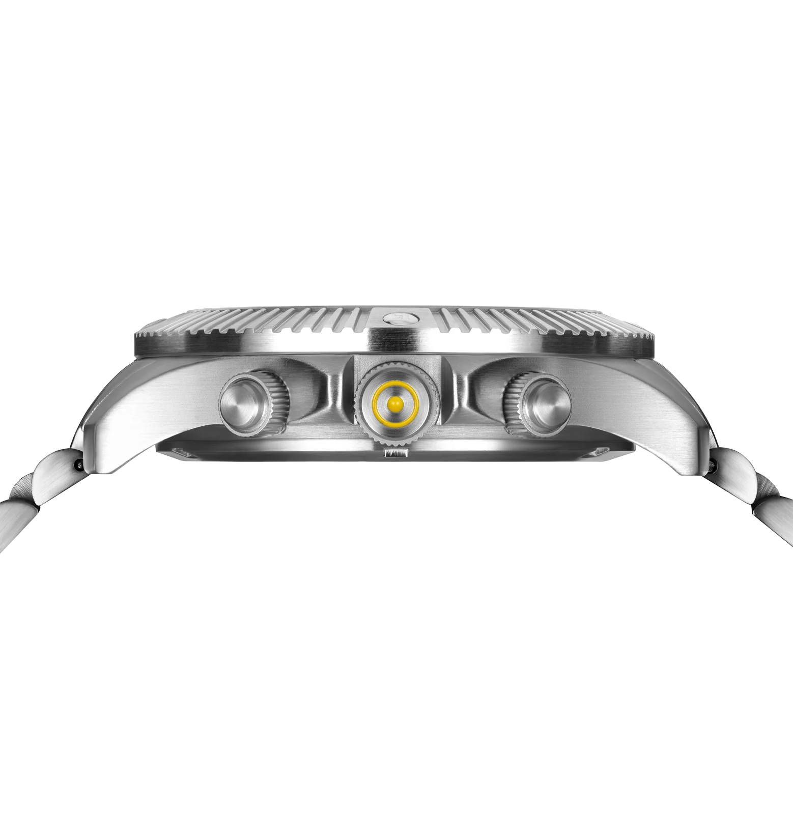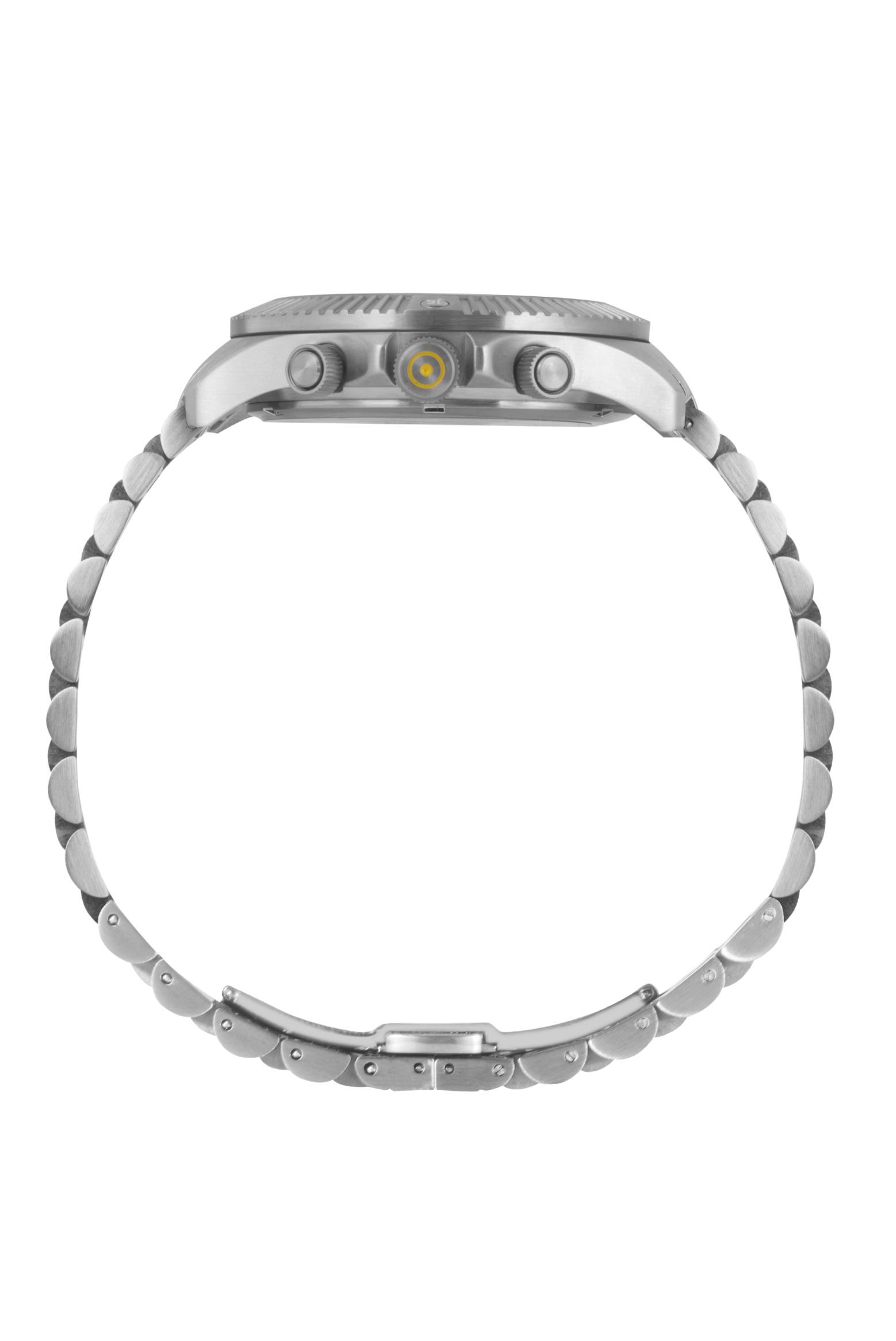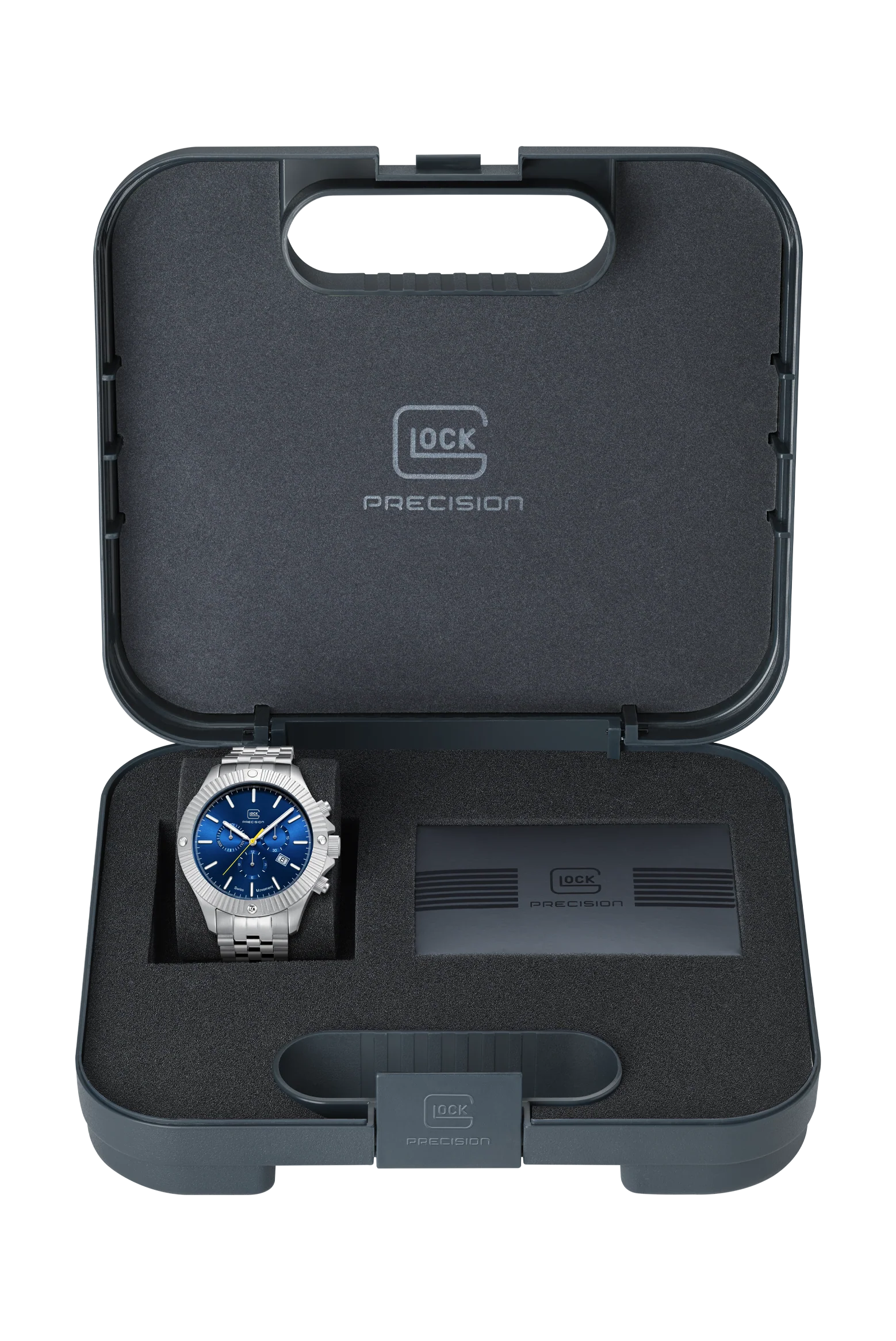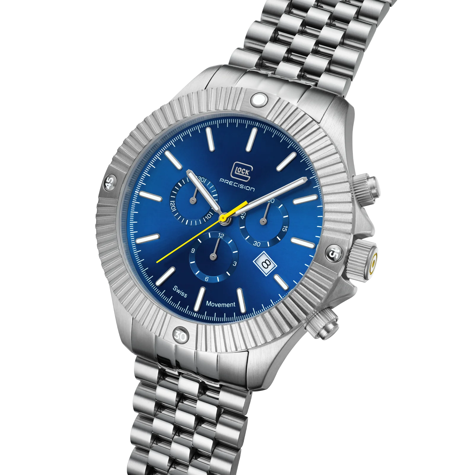 The GLOCK Chronograph Quartz Model: GW-38-2-22 features a deep blue sun-brushed dial surrounded by silver Super-LumiNova® indices with minutes marker track. The 46mm steel case has contoured ridged lugs with a quarter nail-head accented uni-directional bezel.  Luminous silver baton shaped hands with vivid yellow minutes and slanted date window are easily viewable behind a scratch resistant sapphire crystal. Equipped with silver sub-seconds, 30-minute, and 12-hour counter for precision timing. The screw down crown has GLOCK cartridge primer image etched in yellow between steel ridged chronograph pushers and protective crown guard. Fitted with a stainless steel 5-link bracelet with GLOCK logo twin push button pressed deployant clasp to secure in place.