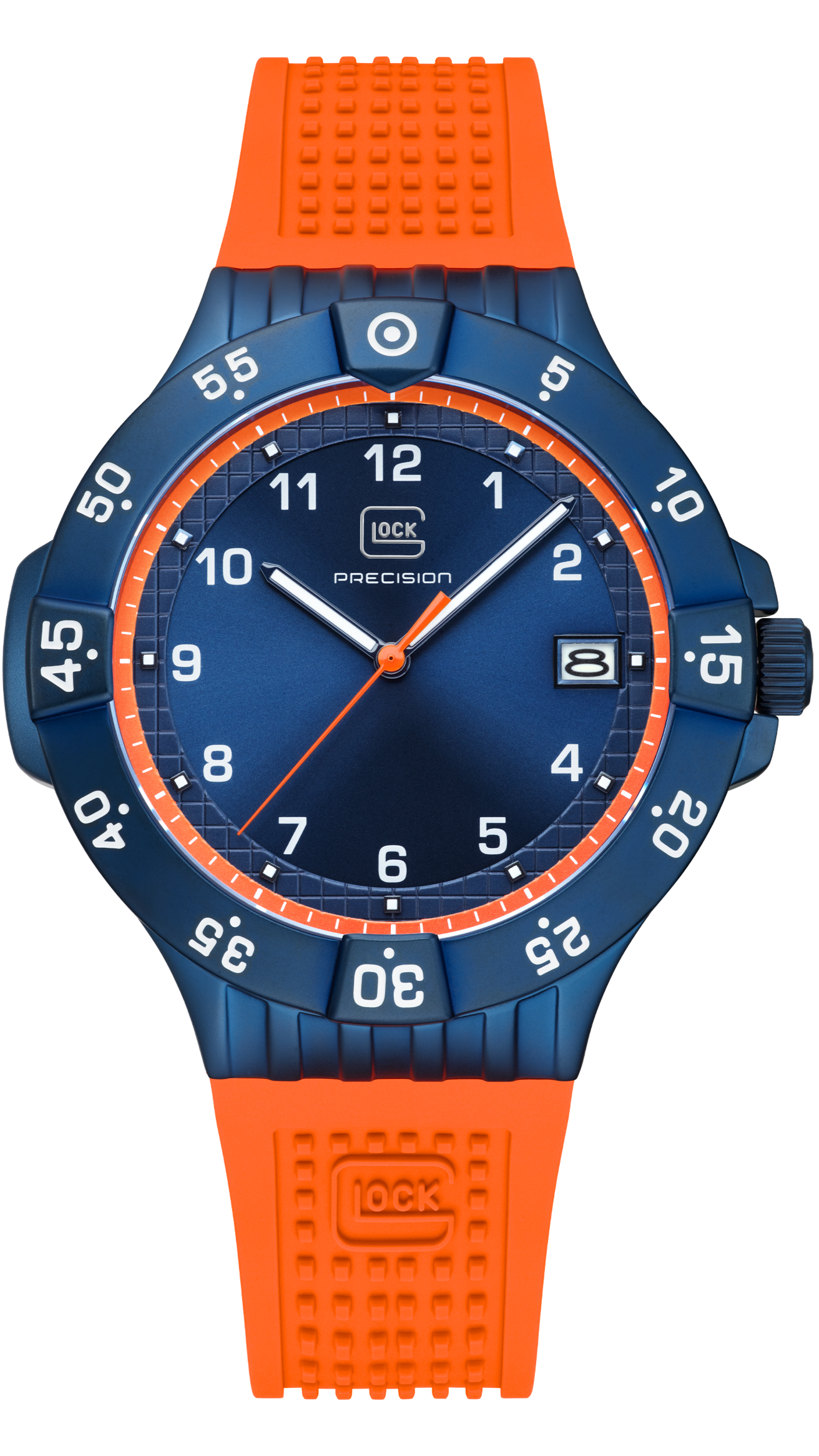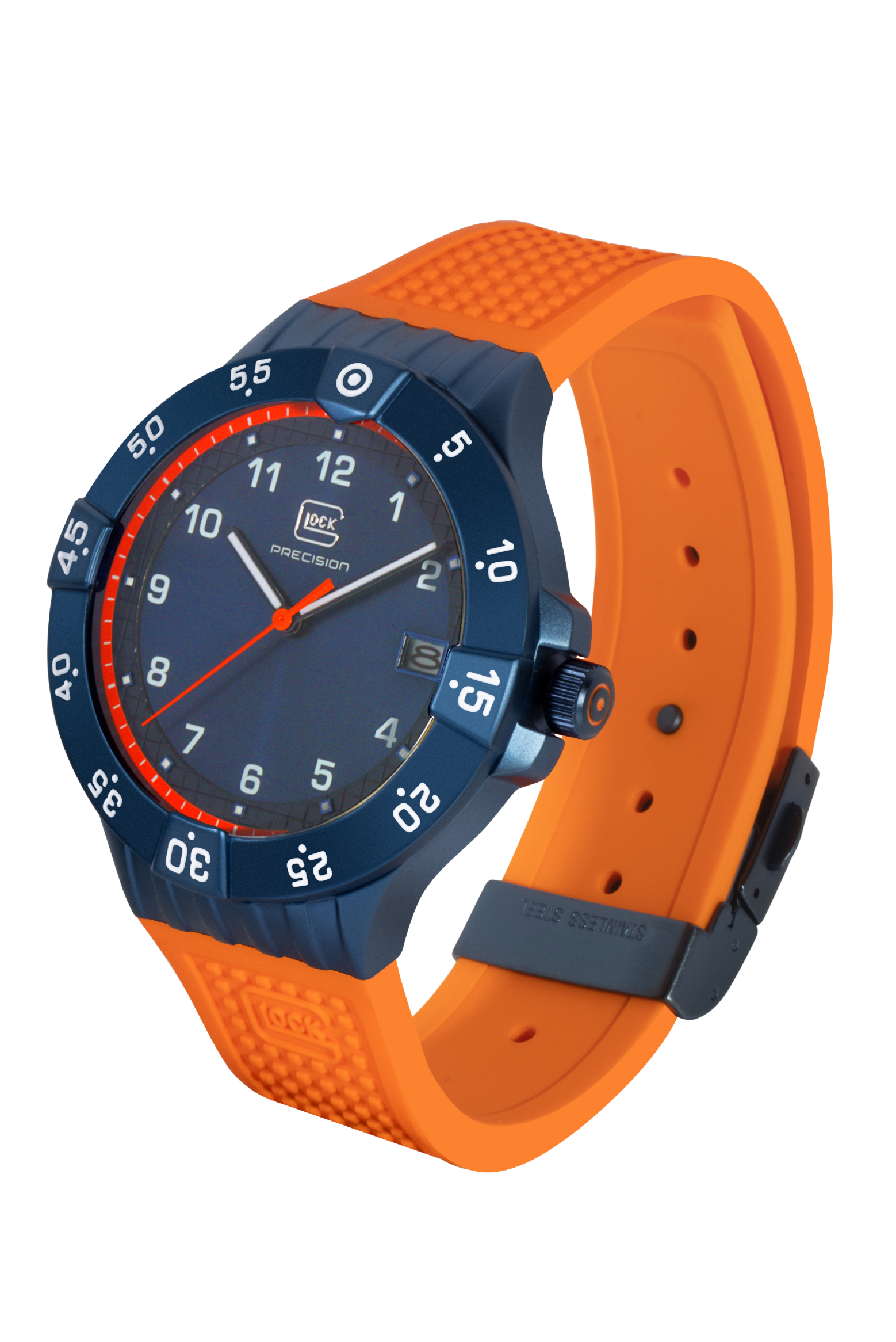 • PVD coated blue steel ridged screw-down crown with etched white GLOCK cartridge primer image between crown guards