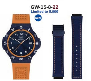 The GLOCK Quartz Model: GW-15-8-22 s a limited edition piece with just 5000 pieces made and includes an additional quick release metal strap. The timepiece has a sandblasted PVD coated blue steel case with unidirectional coin-edged bezel and white 60 minute markers. The 43mm case with contoured ridged lugs has a blue 3D grid textured dial with satin center dial disc under a scratch resistant sapphire crystal. Luminous pencil shaped hands are surrounded by a 60-minutes track for precision timing. Equipped with a date window @3 and luminous Arabic and stick markers on inside chapter ring. An easy grip push-pull crown has GLOCK cartridge primer image etched in white between protective crown guards. Fitted with a orange GLOCK RTF textured pattern rubber silicone strap with PVD coated steel pressed bi-fold deployant clasp to secure in place. Equipped with an additional blue textile strap with orange stitch and specialty blue storage case.