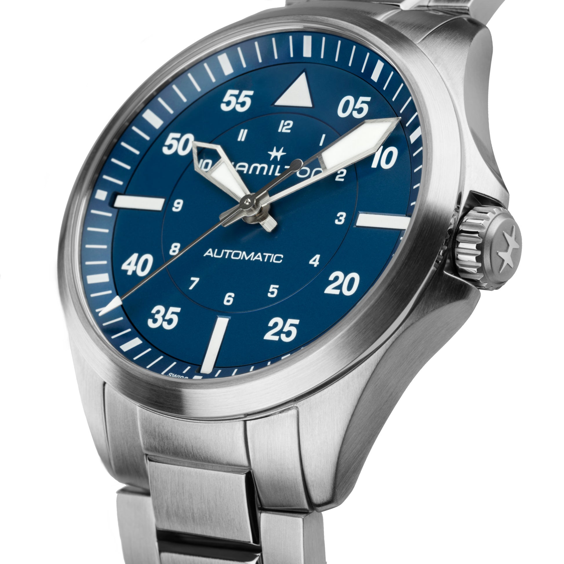 The Khaki Aviation Collection from the HAMILTON Brand is inspired by turn of the twentieth century pioneering pilots and aviators of the time with watch dials representing analog cockpit instruments. The Khaki Aviation Pilot is made with modern innovation keeping in mind tradition with vintage classic style. The automatic wrist watch is equipped with the H-10 caliber movement with an impressive 80 hour power reserve viewable behind the exhibition case-back. Model #H76305140 has a 39mm brushed stainless steel case with scratch resistant sapphire crystal. Featuring luminous skeleton syringe style hands and oversize stick markers for easy legibility. The blue satin dial has small inner 12 hours scale surrounded by 60 minute Arabic numerals minutes track on outer dial. Fitted a with a stainless steel crown secured within a crown guard with a 100 meter water resistance rating.  Finished with a stainless steel twin push button bi-fold stainless steel bracelet and Hamilton insignia.