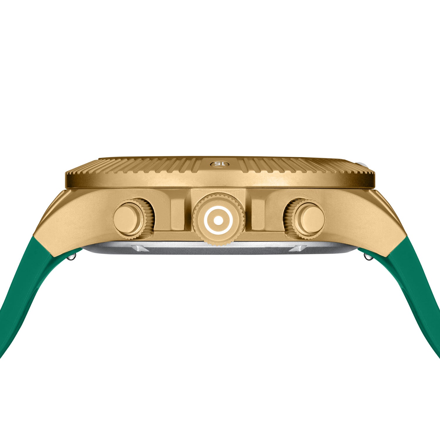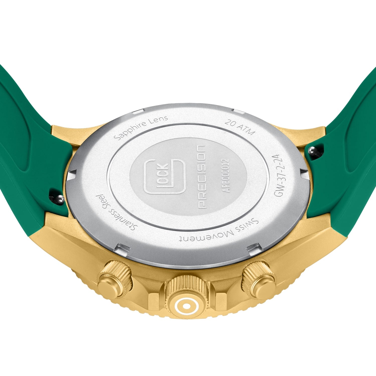 The GLOCK Chronograph Quartz Model: GW-37-2-24 features an emerald green sun-brushed dial surrounded by gold-tone luminous indices and minutes marker track. The yellow PVD coated 44mm steel case has contoured ridged lugs with a quarter nail-head accented uni-directional bezel.  Luminous gold-tone baton shaped hands with slanted date window are easily viewable behind a scratch resistant sapphire crystal. Equipped with gold-tone sub-seconds, 30-minute, and 12-hour counter for precision timing. The screw down crown has GLOCK cartridge primer image etched in white between gold-tone PVD coated steel ridged chronograph pushers and protective crown guard. Fitted with a Kelly green rubber silicone strap with raised GLOCK lettering and steel PVD coated pressed bi-fold deployant clasp to secure in place.