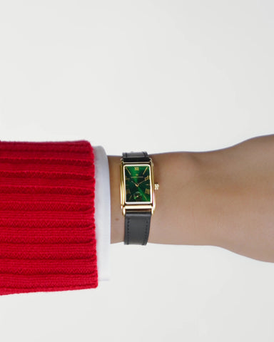 The American Classic Collection was pioneered for Hollywood's stars seen on screen by the HAMILTON brand with signature styles and timeless designs. The Ardmore Series, worn by ladies since the original 1936 Art-Deco inspired piece has remained a classic in the HAMILTON line. The quartz model #H11261760 has a polished gold-tone PVD coated stainless steel rectangular tank shaped case with a curved mineral crystal. The green sunbrushed dial has a mix of slanted and curved Roman and stick markers with polished leaf shaped hands. A small sub-seconds dial is positioned within the 6 marker. The double stacked stainless steel crown has 30 meter water resistance rating. Finished with a smooth black calf-skin leather strap with contrasting white stitch and polished gold-tone PVD coated stainless steel tang buckle with Hamilton emblem.