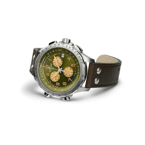 The Khaki Aviation Collection from the HAMILTON Brand is inspired by turn of the twentieth century pioneering pilots and aviators of the time, made with modern innovation keeping in mind tradition with classic American style. The X-Wind Chronograph Quartz features a drift-angle calculator within the bezel, enabling the compacity to accurately calculate and record crosswinds during pilots flight journeys. Model #H77932160 has a 46mm brushed and polished stainless steel case behind a scratch resistant sapphire crystal. The khaki green sun-brushed dial has 24hour, sub-seconds and 12 hour sub-dials surrounded by easily legible Arabic numerals with minutes track. Fitted with luminous pencil style hands with date window @3. Two individual drift angle bezel crown operation buttons are opposite side to not interfere with the stainless steel screw-down crown and polished chrono pushers. Finished with brown calf-skin leather strap with stainless steel rivet accents and white contrasting stitch.