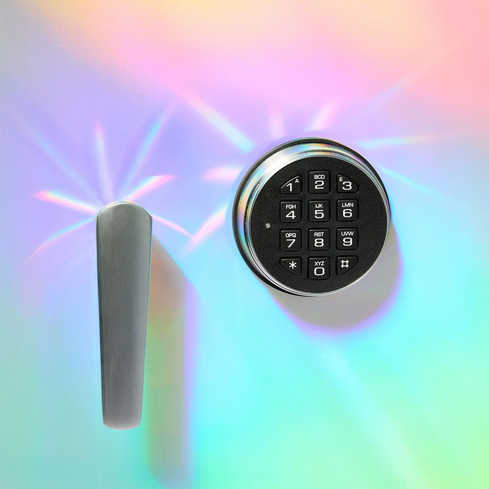 The Bea Bongiasca Collection is inspired by the eclectic Italian jewelry designer by the same name from the WOLF 1834 Brand. Taking inspiration from the world of Pop-art with contemporary colors and design, the watch winding and storage safes offer premium protection and security incorporating playful fun with style. Certified by the UL (Underwriters Laboratory), and equipped with a Palusol® fire sealed door with keypad combination lock your valuables will be safe within. The 4-unit watch winding safe is composed of an armored plated steel frame painted with high gloss iridescent lacquered finish and with polished chrome hardware. The interior has several colorful vegan leather covered storage drawers lined in a soft decorative embroidered micro-suede with a variety of interior storage compartment combinations. Fitted with 4 removable bi-colored watch cuffs to accommodate watches up to 52mm in size is easily viewable with interior LED lighting.