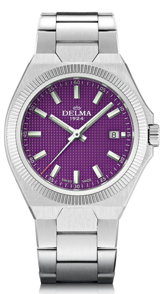 Meeting the demands of the modern wearer, DELMA's Midland Collection is inspired by a look back in time with bold geometric shapes incorporating a new integrated bracelet. Midland was one of the initial four brands used by DELMA’s founder in the 1920’s and also takes its namesake from a model in the 1980’s. The 40.5mm brushed stainless steel tonneau shaped case with a polished fixed fluted bezel encase a purple guilloche pyramid pattern dial. Applied Super-LumiNova indices  with date window @3 sit behind an anti-reflective sapphire crystal. Luminous baton shaped hands with red tipped central seconds are surrounded by a minutes track. Fitted with a polished and brushed integrated stainless steel 3-link bracelet with security fold-over push button deployment clasp to secure in place.