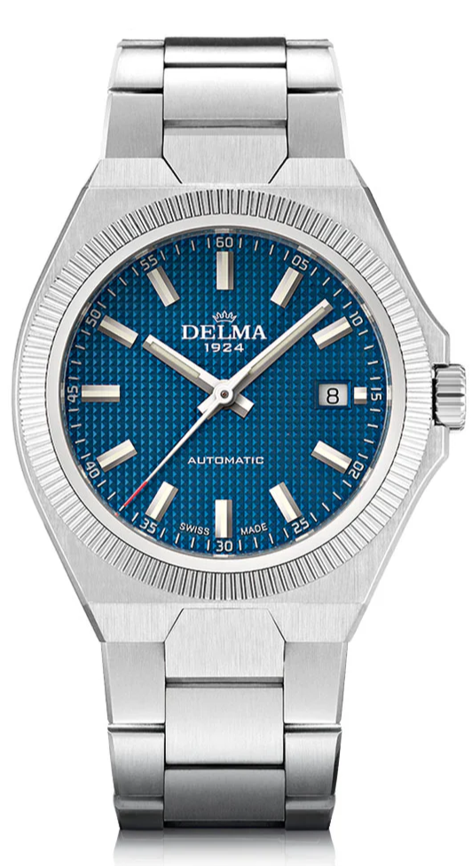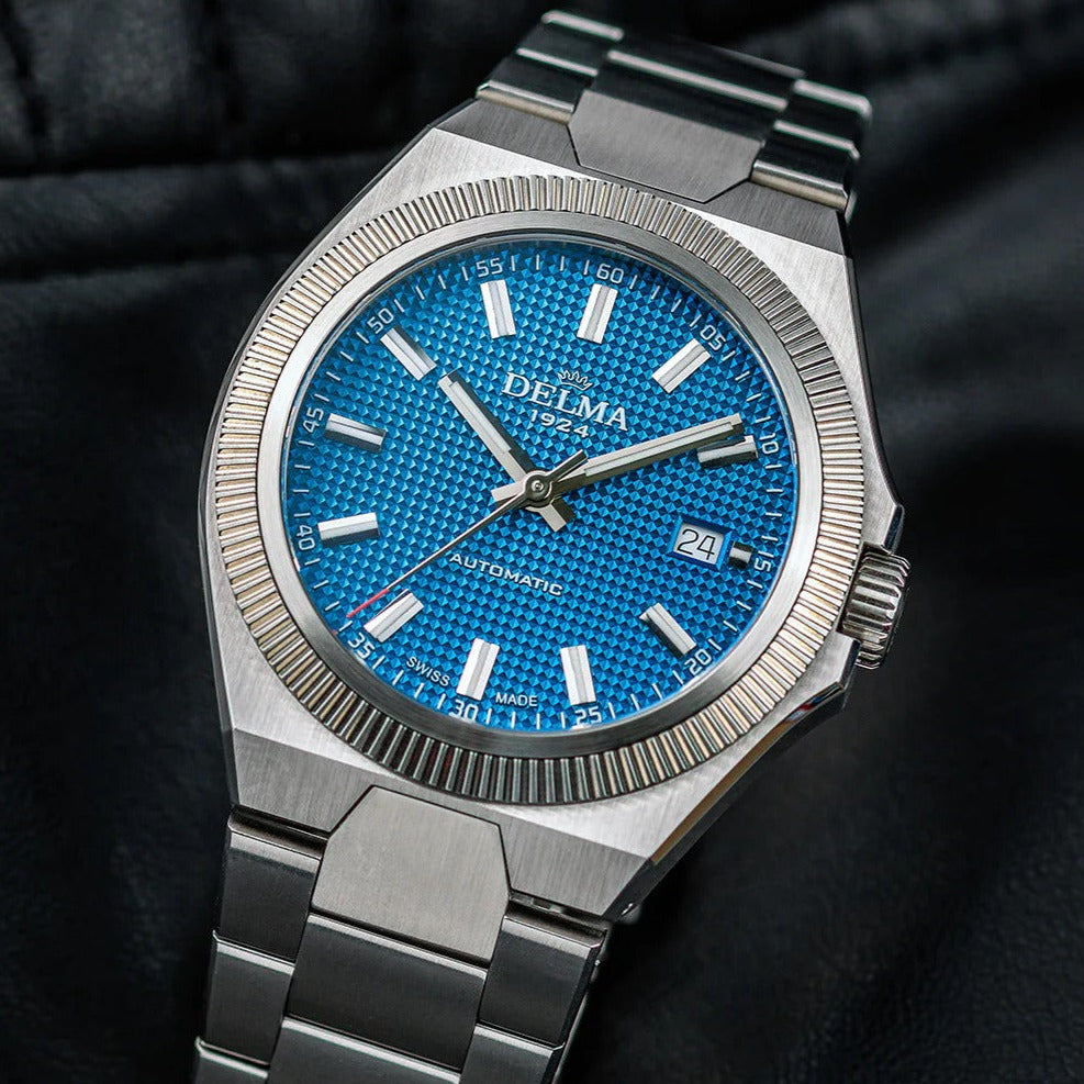 Meeting the demands of the modern wearer, DELMA's Midland Collection is inspired by a look back in time with bold geometric shapes incorporating a new integrated bracelet. Midland was one of the initial four brands used by DELMA’s founder in the 1920’s and also takes its namesake from a model in the 1980’s. The 40.5mm brushed stainless steel tonneau shaped case with a polished fixed fluted bezel encase a blue guilloche pyramid pattern dial. Applied Super-LumiNova indices  with date window @3 sit behind an anti-reflective sapphire crystal. Luminous baton shaped hands with red tipped central seconds are surrounded by a minutes track. Powered by automatic caliber SW200-1 movement with DELMA's own custom rotor and 41 hour power reserve viewable within the exhibition case-back. Fitted with a polished and brushed integrated stainless steel 3-link bracelet with security fold-over push button deployment clasp to secure in place.