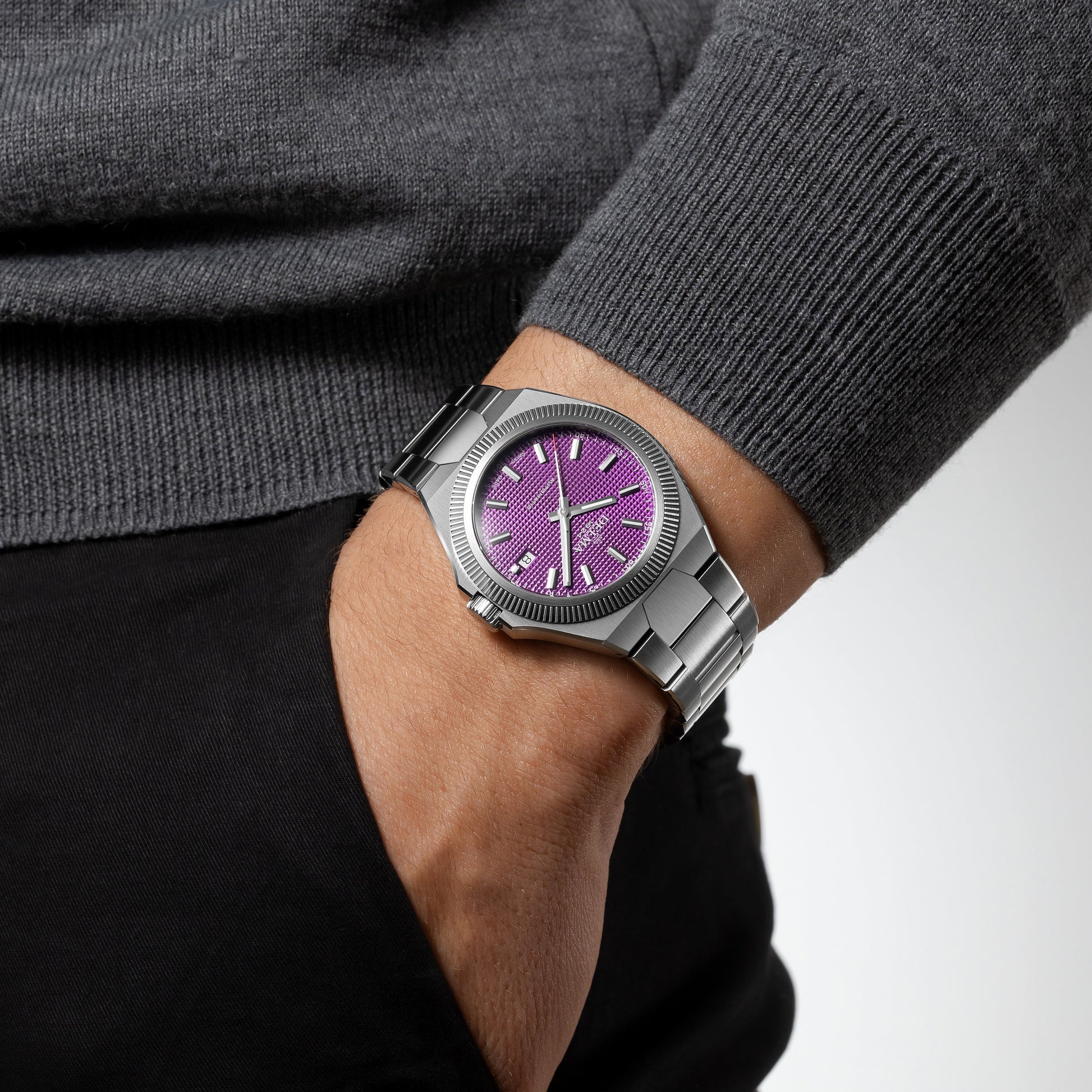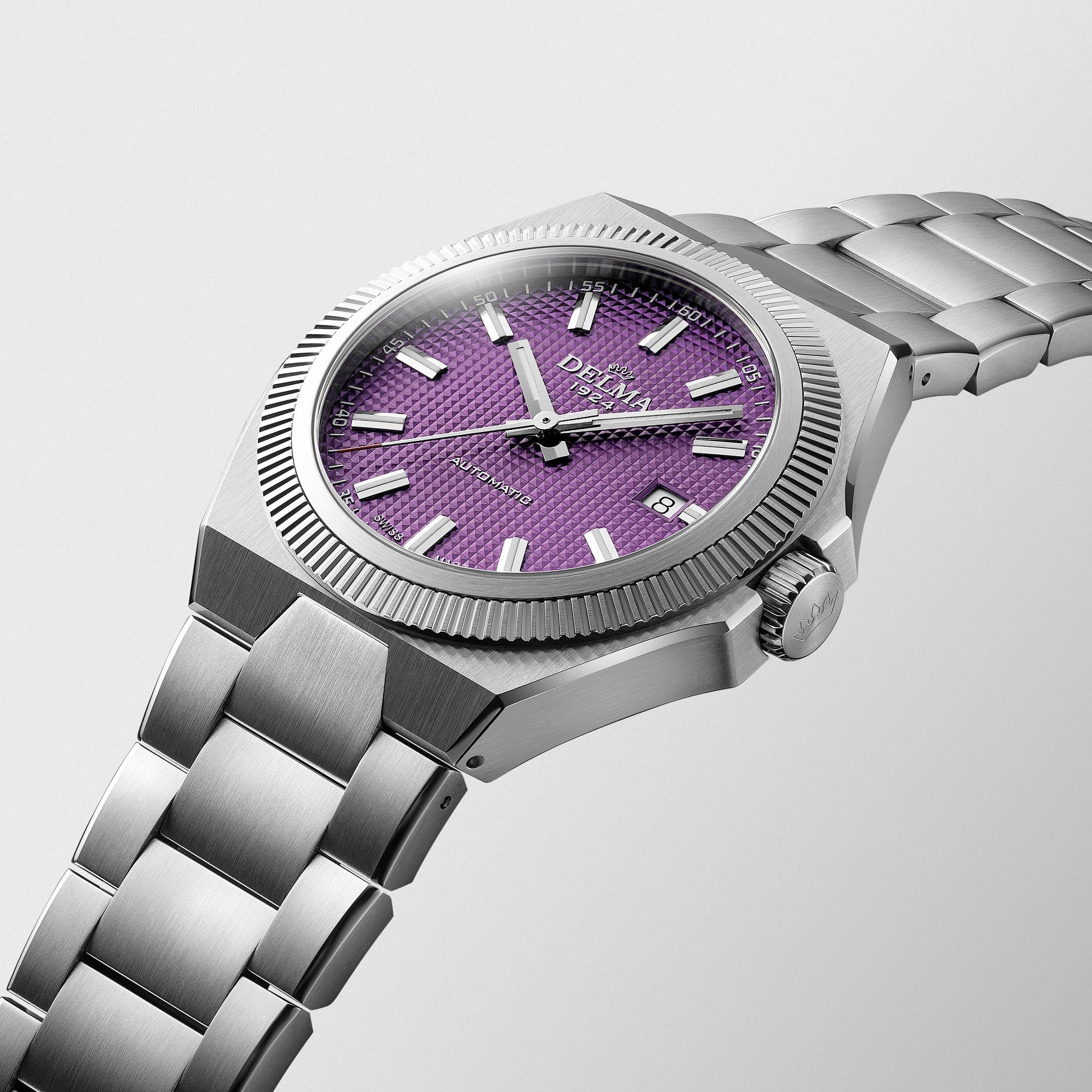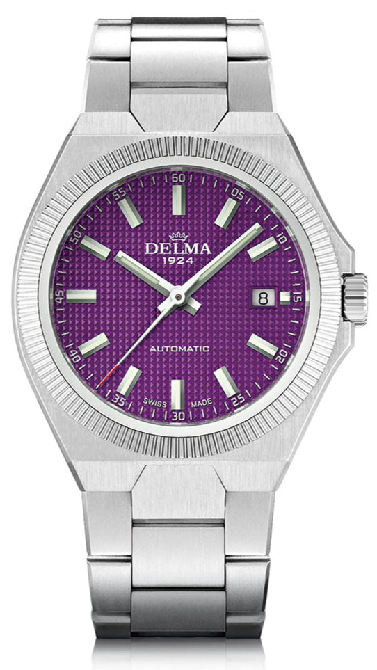 Meeting the demands of the modern wearer, DELMA's Midland Collection is inspired by a look back in time with bold geometric shapes incorporating a new integrated bracelet. Midland was one of the initial four brands used by DELMA’s founder in the 1920’s and also takes its namesake from a model in the 1980’s. The 40.5mm brushed stainless steel tonneau shaped case with a polished fixed fluted bezel encase a purple guilloche pyramid pattern dial. Applied Super-LumiNova indices  with date window @3 sit behind an anti-reflective sapphire crystal. Luminous baton shaped hands with red tipped central seconds are surrounded by a minutes track. Powered by automatic caliber SW200-1 movement with DELMA's own custom rotor and 41 hour power reserve viewable within the exhibition case-back. Fitted with a polished and brushed integrated stainless steel 3-link bracelet with security fold-over push button deployment clasp to secure in place.