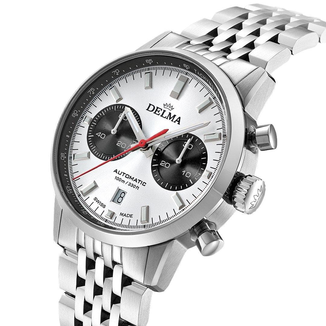 The Continental timepiece collection from the DELMA brand, reimagines vintage 1960s style with modern innovations, sporty details mixed with quality finishes. The 42mm stainless steel case has a bi-color sun-ray brushed dial with guilloche patterned sub-seconds, and 30-minute sub-dial complete with date window @6. Large luminous indices are surrounded by a minutes track and black tachymeter on outer dial disc makes the chronograph easily legible for precision timing.  Super-lumiNova pencil shaped hands with prominent red central seconds sit behind an anti-reflective sapphire crystal. The sturdy robust polished chronograph pushers sit between the 100 meter water resistant easy-grip screw-down crown. Powered by automatic chronograph SW510 bicompax movement with DELMA's own custom rotor and 48 hour power reserve is viewable within the exhibition case-back. Fitted with a polished and brushed stainless steel 7-link bracelet with security fold-over deployment clasp to secure in place.
