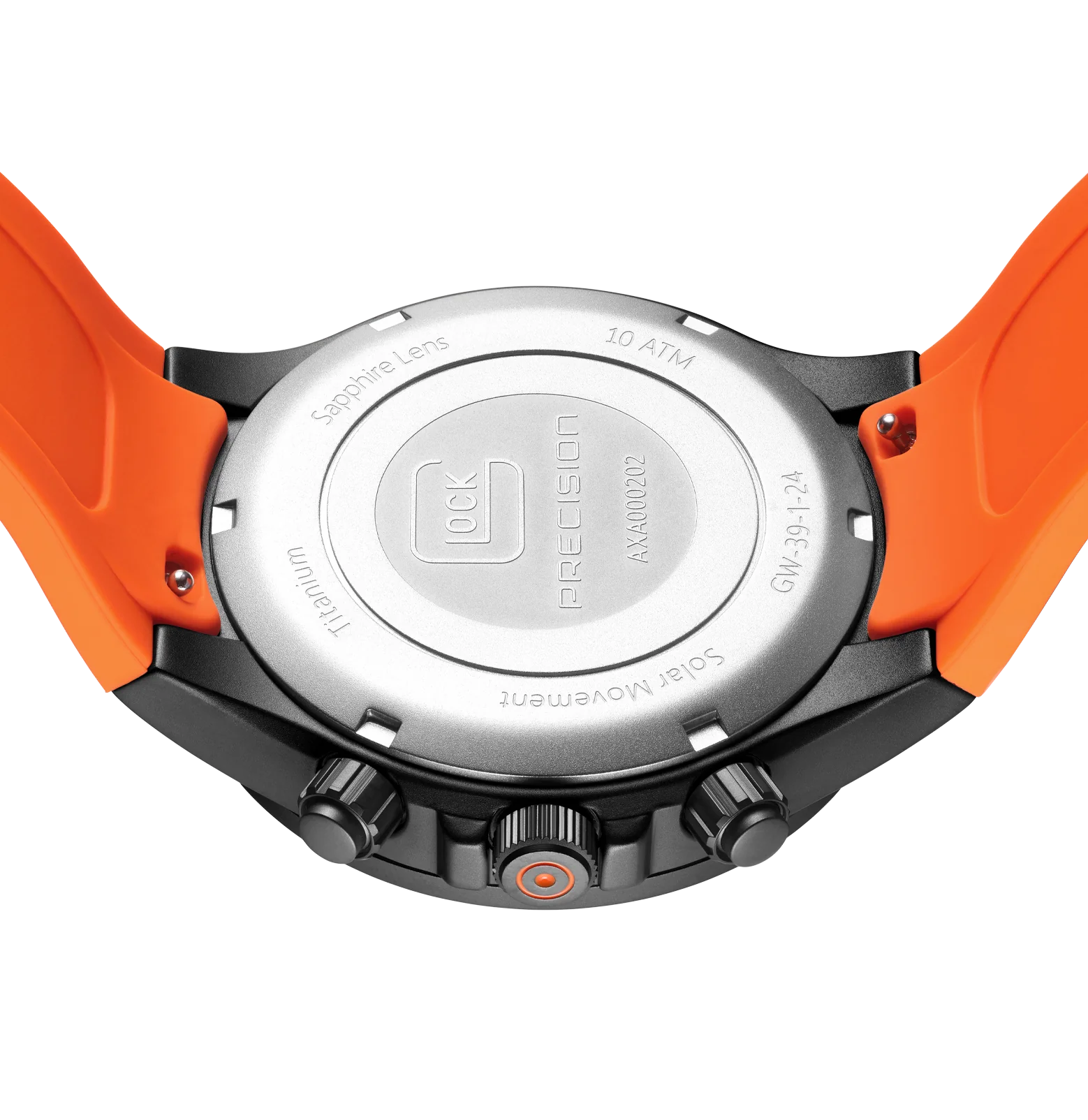 The GLOCK Chronograph Solar powered timepiece Model: GW-39-1-24 features an all black satin dial with vibrant accents of orange with 42mm black PVD coated sandblasted steel case and contoured ridged lugs. Luminous orange baton shaped hands are surrounded by luminous indices and minutes marker track on outer dial makes for easy legibility behind a scratch resistant sapphire crystal. Equipped with sub-seconds, 30-minute, and 12-hour counter with slanted date window @4 for precision timing. The black PVD coated sandblasted steel crown has GLOCK cartridge primer image etched in orange between protective crown guard and chronograph pushers. Fitted with an orange GLOCK RTF textured pattern rubber silicone strap with black PVD coated steel pressed bi-fold deployant clasp to secure in place.