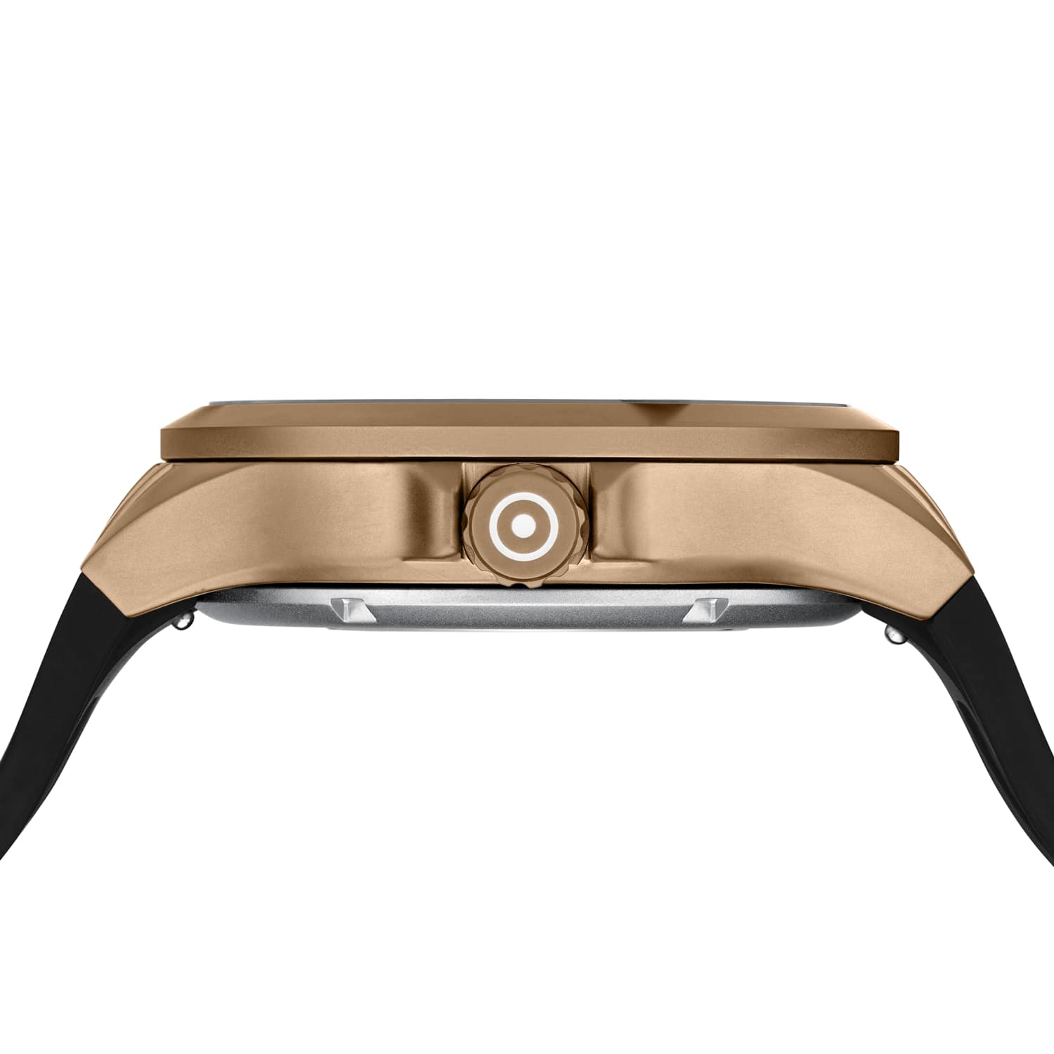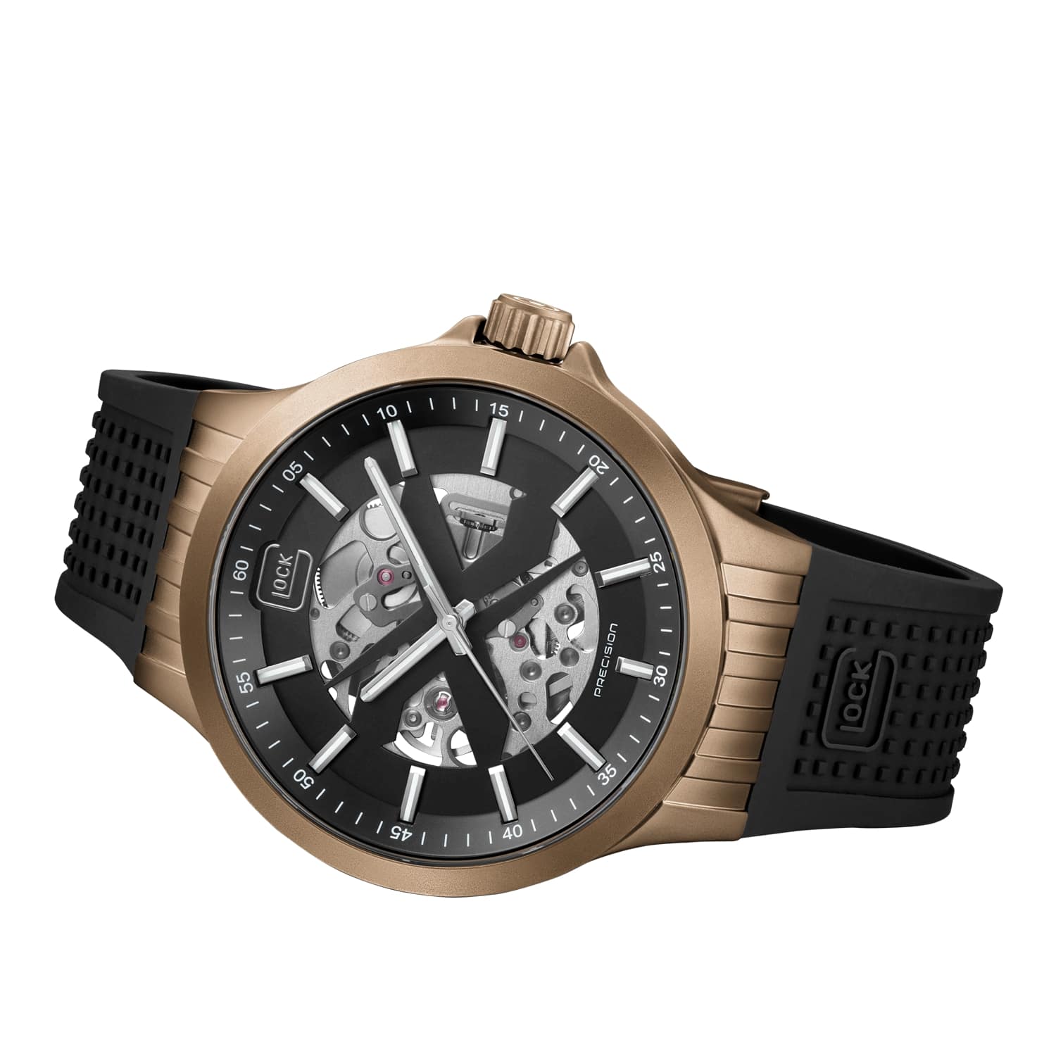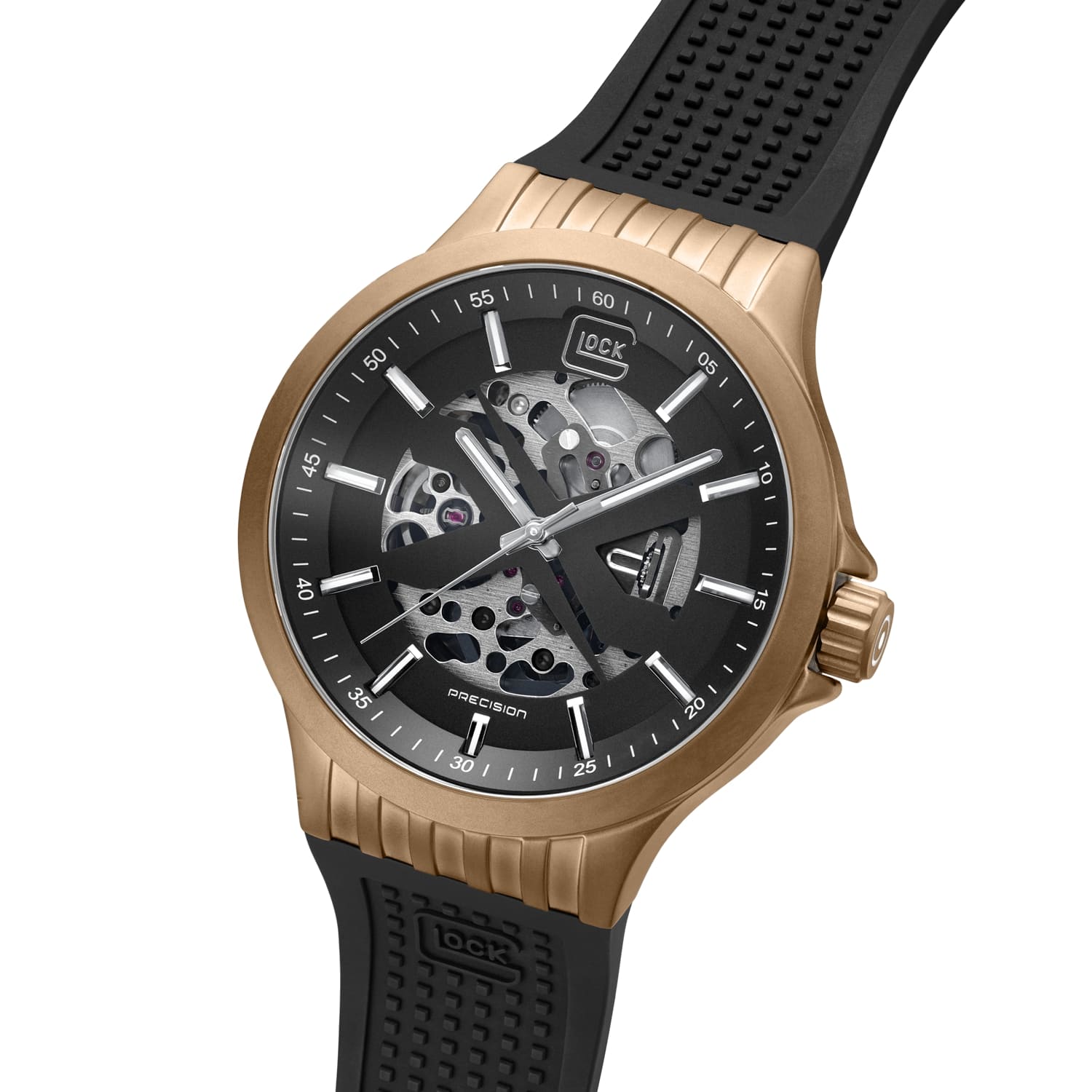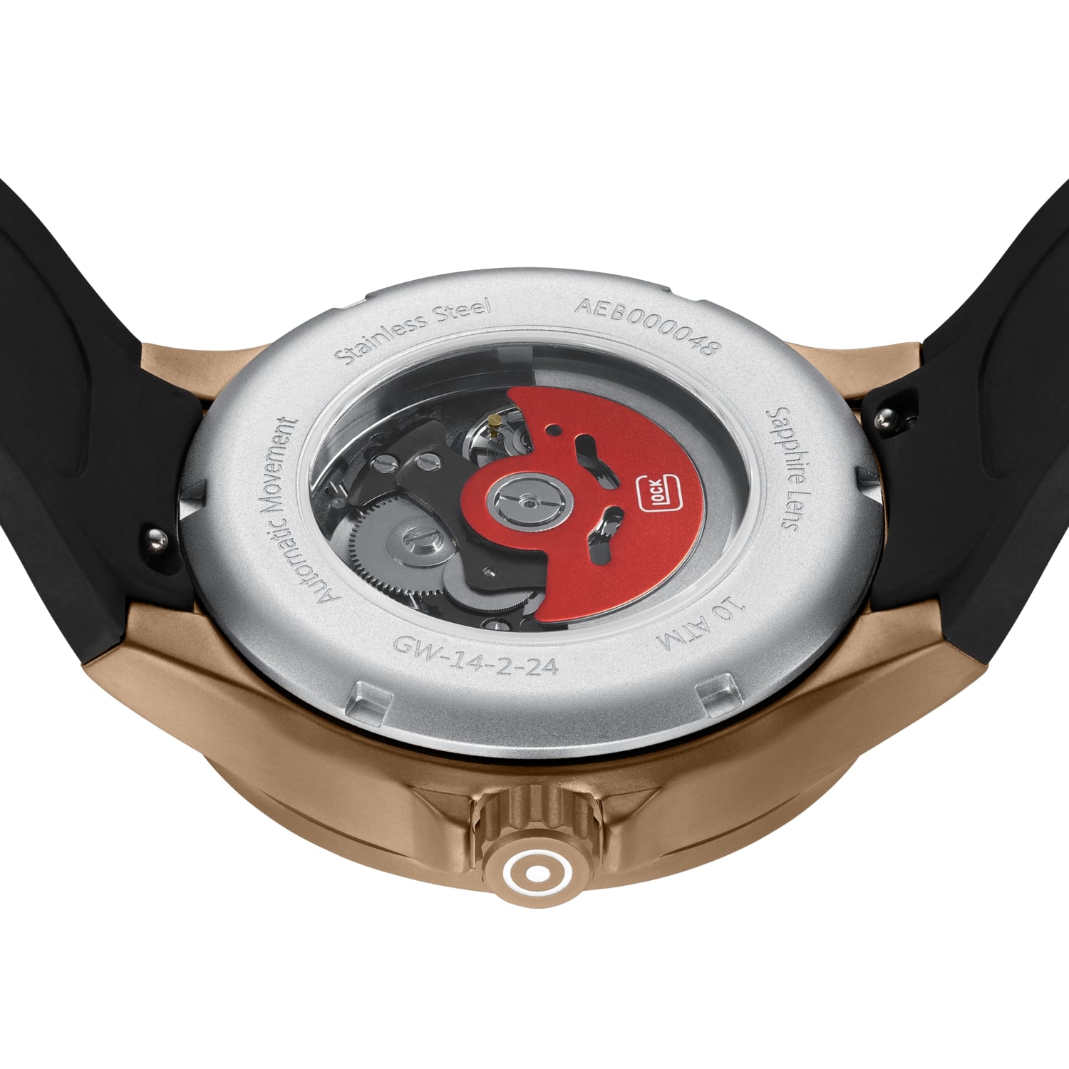 The GLOCK Skeleton Open-heart Automatic Model: GW-14-2-24 features a dial that displays the Swiss movement inner workings of the watch on both the dial front and the exhibition case-back.  The sandblasted PVD coated coyote steel 44mm steel case has contoured ridged lugs and cut-outs within the black satin dial. Silver Super-Luminova® baton shaped hands and applied indices are surrounded by a beveled minutes track viewable behind a scratch resistant sapphire crystal. The screw down PVD coated crown has GLOCK cartridge primer image etched in white between a protective crown guard to combat dirt intrusion. Fitted with a black GLOCK RTF textured pattern rubber silicone strap with rose-tone PVD coated steel pressed bi-fold deployant clasp to secure in place.
