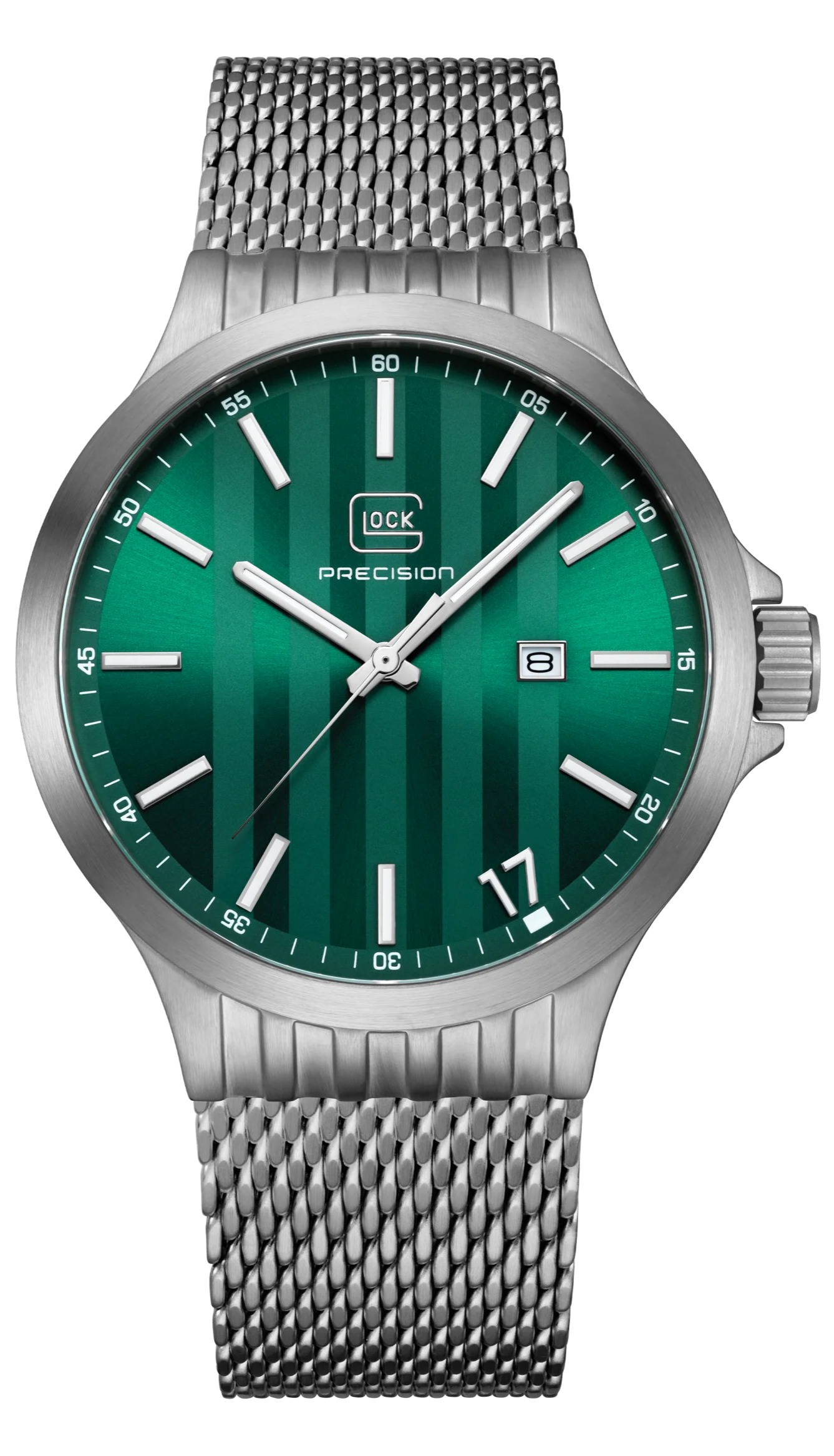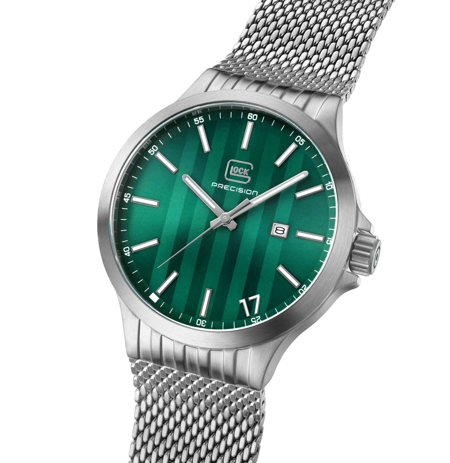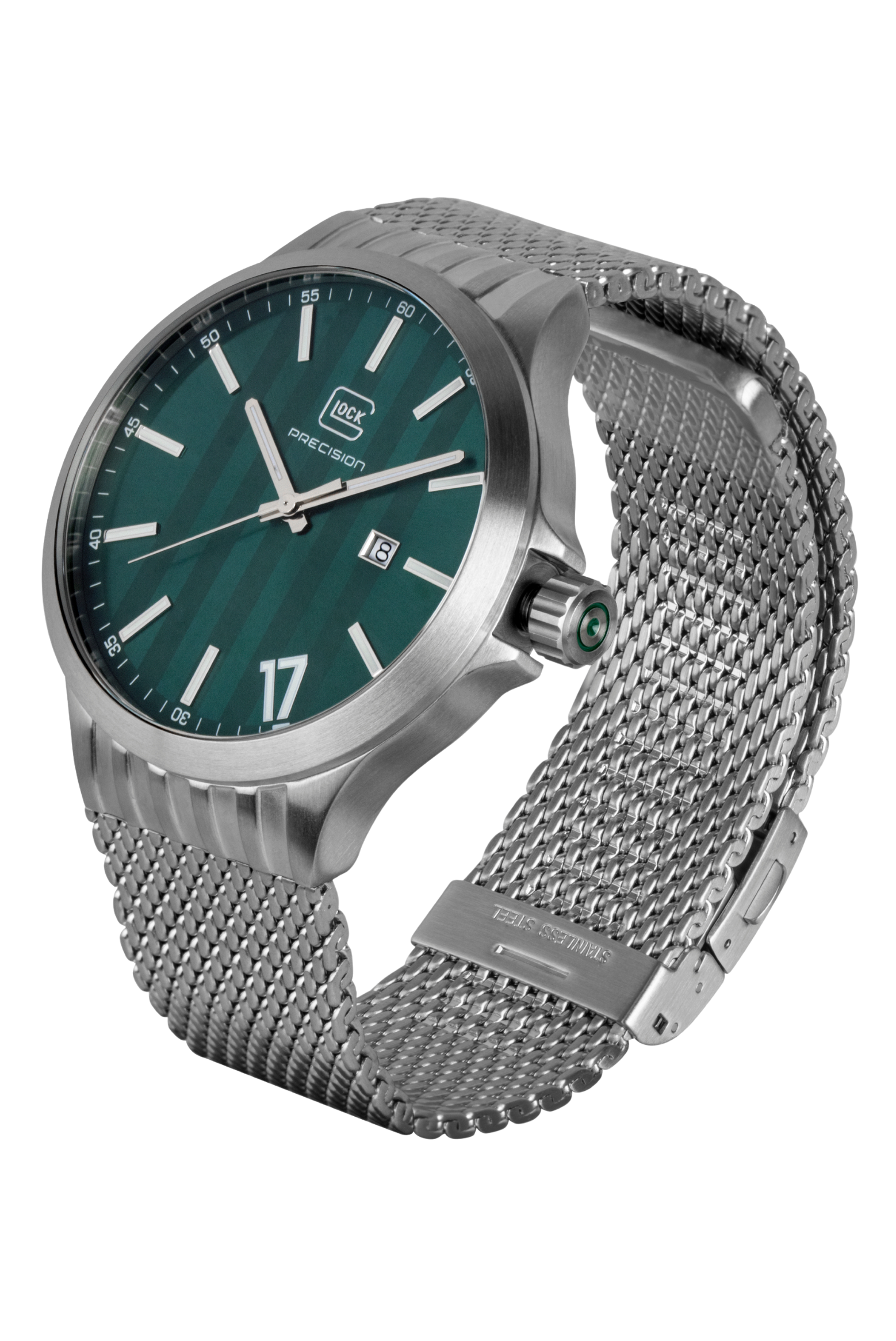 The GLOCK Quartz Model: GW-12-3-24 timepiece features a sun-brushed emerald green horizontal serration pattern dial. The sandblasted steel 44mm case has contoured ridged lugs. Luminous pencil shaped hands are surrounded by a 60-minutes under a scratch resistant sapphire crystal. Equipped with a date window @3 and luminous stick markers with oversize accent Arabic numeral "17" referencing a signature glock gun. An easy grip push-pull crown has GLOCK cartridge primer image etched in green between protective crown guards. Fitted with a steel metal mesh strap with pressed bi-fold deployant clasp to secure in place.