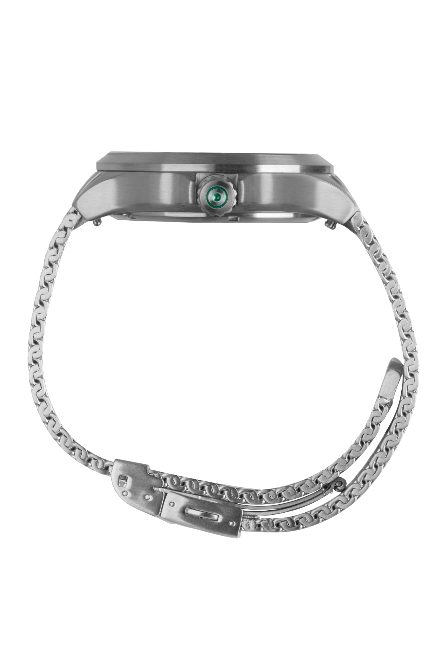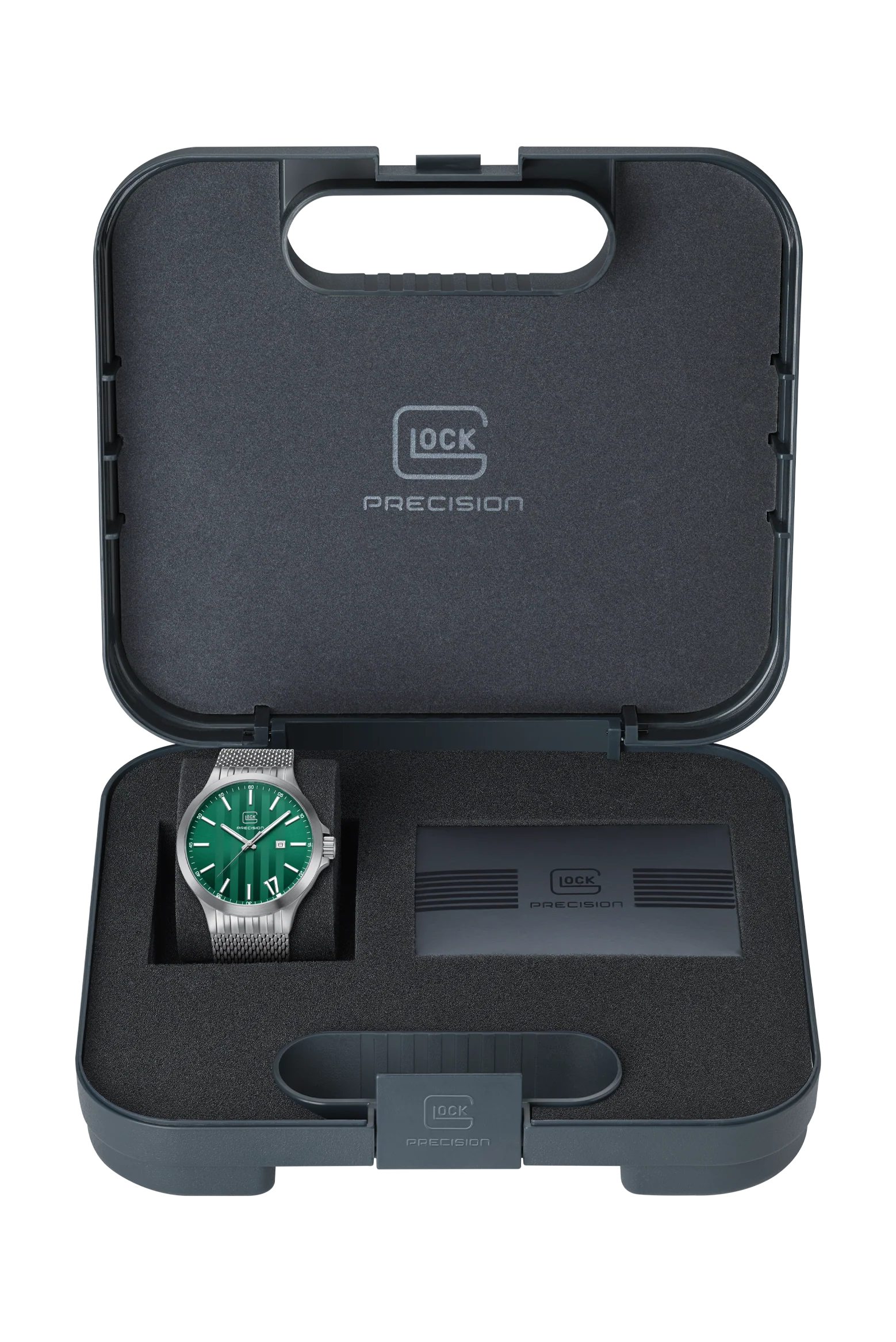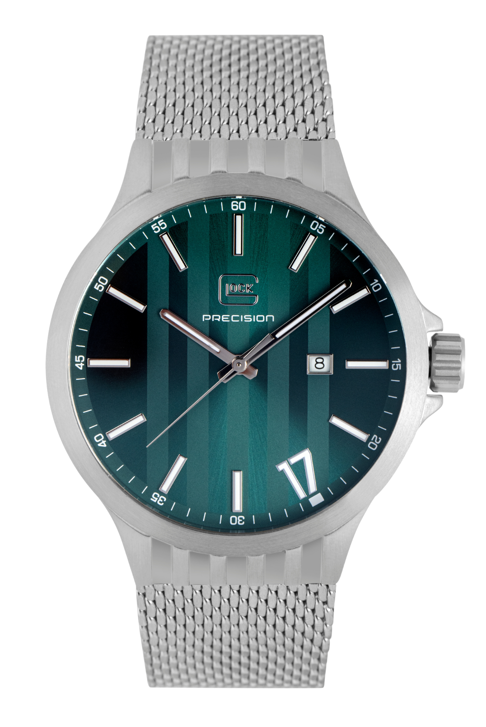 The GLOCK Quartz Model: GW-12-3-24 timepiece features a sun-brushed emerald green horizontal serration pattern dial. The sandblasted steel 44mm case has contoured ridged lugs. Luminous pencil shaped hands are surrounded by a 60-minutes under a scratch resistant sapphire crystal. Equipped with a date window @3 and luminous stick markers with oversize accent Arabic numeral "17" referencing a signature glock gun. An easy grip push-pull crown has GLOCK cartridge primer image etched in green between protective crown guards. Fitted with a steel metal mesh strap with pressed bi-fold deployant clasp to secure in place.