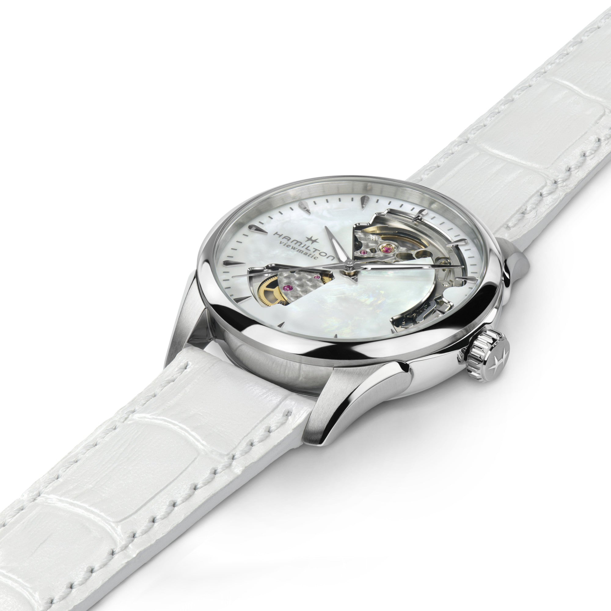 The Jazzmaster by the Hamilton Brand is a line of contemporary modern timepieces made with refined, quality craftsmanship. The automatic wrist watch features the reliable and accurate H-10 caliber movement, with an impressive 80 hour power reserve viewable behind an exhibition case-back. Model #H32215890 has a 36mm polished stainless steel case with and scratch resistant sapphire crystal. The mother-of-pearl dial has precision cutouts with open hearts to showcase just a hint of the interior case movement within. Equipped with polished diamond shaped markers and sleek luminous sword style hands with minutes  track on outer dial. Fitted with an push/pull easy grip oversized crown with 50m water resistance. Finished with a white alligator grained calf skin leather strap with matching stitch with stainless steel tang pin buckle with Hamilton emblem.