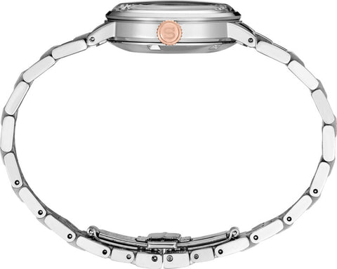 The Seiko Presage Watch Collection is inspired by the glamorous jet-set cocktail bars with slim polished markers and delicate curved hands reminiscent of a martini glass with a sleek and svelte design. The Ladies Presage SRE009 is inspired by the Clover Club cocktail with white pressed patterned gloss finished dial under a box-shaped hardlex crystal. The 30.3mm polished stainless steel two-tone case has exhibition case back showcasing Seiko's own 2R05 caliber movement.  Featuring razor sharp sword style hands with slim open diamond shaped seconds is surrounded by 8 genuine diamonds within faceted polished rose-tone markers. Fitted with a polished and brushed stainless steel bracelet with twin push button tri-fold safety clasp closure to keep your watch in place. Has 50 meter water resistance with date window @3, easy-grip oversize rose-tone crown with both automatic and convenient manual wind capacity for easy setting.