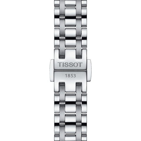 Part of the T-LADY Collection, the Bellissima Series from the Tissot Watch Brand is a compact, classic and stylish dress watch for ladies with all the elements of sophistication with quality Swiss watchmaking function. The ladies battery operated quartz model #T126.010.11.013.00 has a 26mm stainless steel case with polished bezel and silver satin dial with textured wave pattern on central dial disc. Fitted with a cabochon white jewel tipped push-pull crown with 50 meter water resistance rating. Sword shaped hands and contoured black roman numerals are surrounded by a minutes track on outer dial. A circular date window@6 is easily legible under an anti-reflective scratch resistance sapphire crystal. Finished with a brushed and polished stainless steel jubilee style bracelet with bi-fold deployment safety clasp with Tissot emblem.
