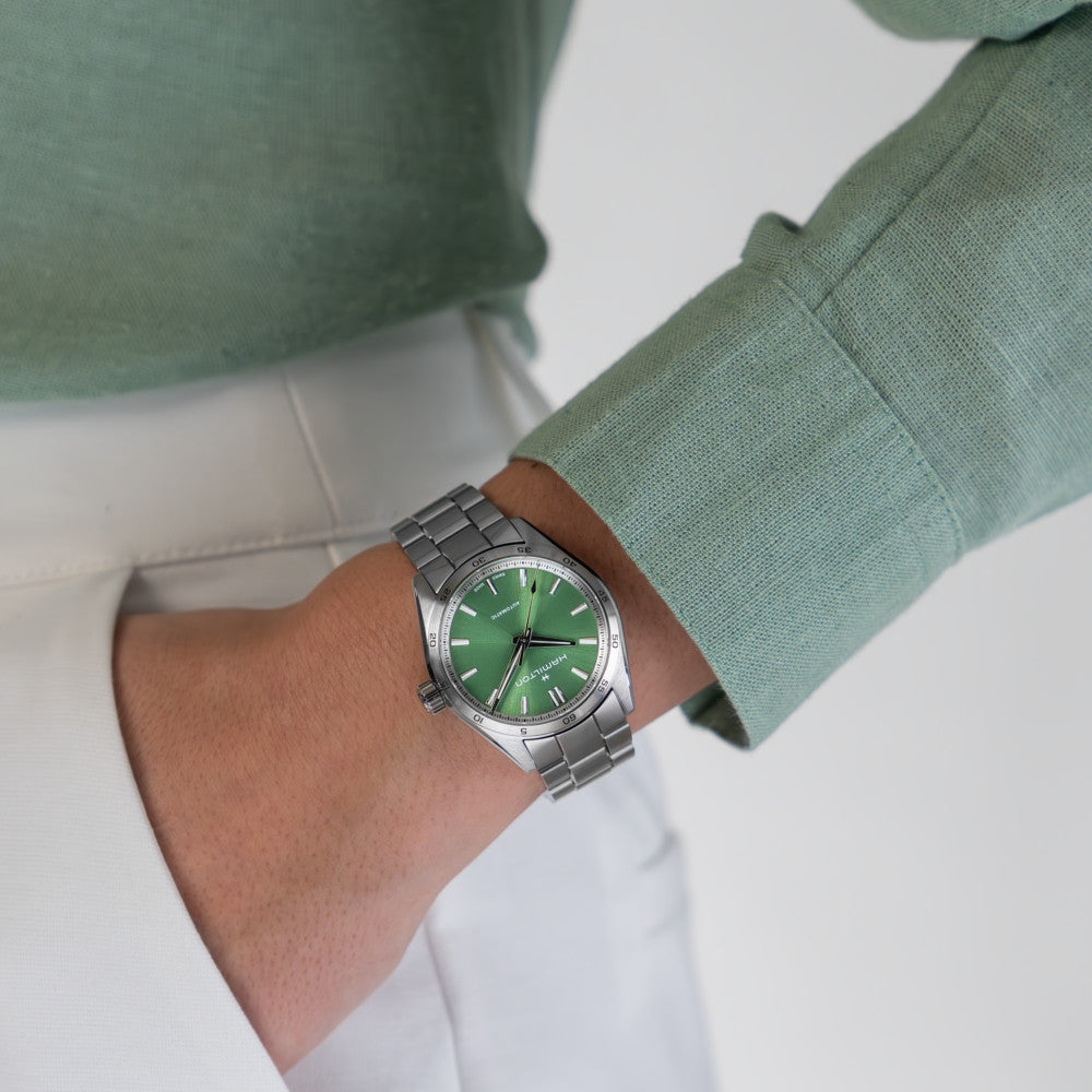 The Jazzmaster by the Hamilton Brand is a line of contemporary and modern timepieces made with refined, quality craftsmanship. The Performer is a sporty chic automatic wrist watch featuring the reliable and accurate H-10 caliber movement with an impressive 80 hour power reserve viewable behind the exhibition case-back. Model #H36105160 has a 34mm polished stainless steel case with fixed bezel and printed numbers. A green dial is viewable under a scratch resistant sapphire crystal.  Equipped with applied luminous markers and sword style hands surrounded by a minutes track on outer dial edge. An easy grip oversize screw-down crown has 100m water resistance rating. Finished with a stainless steel twin push button bi-fold bracelet with embossed Hamilton insignia.
