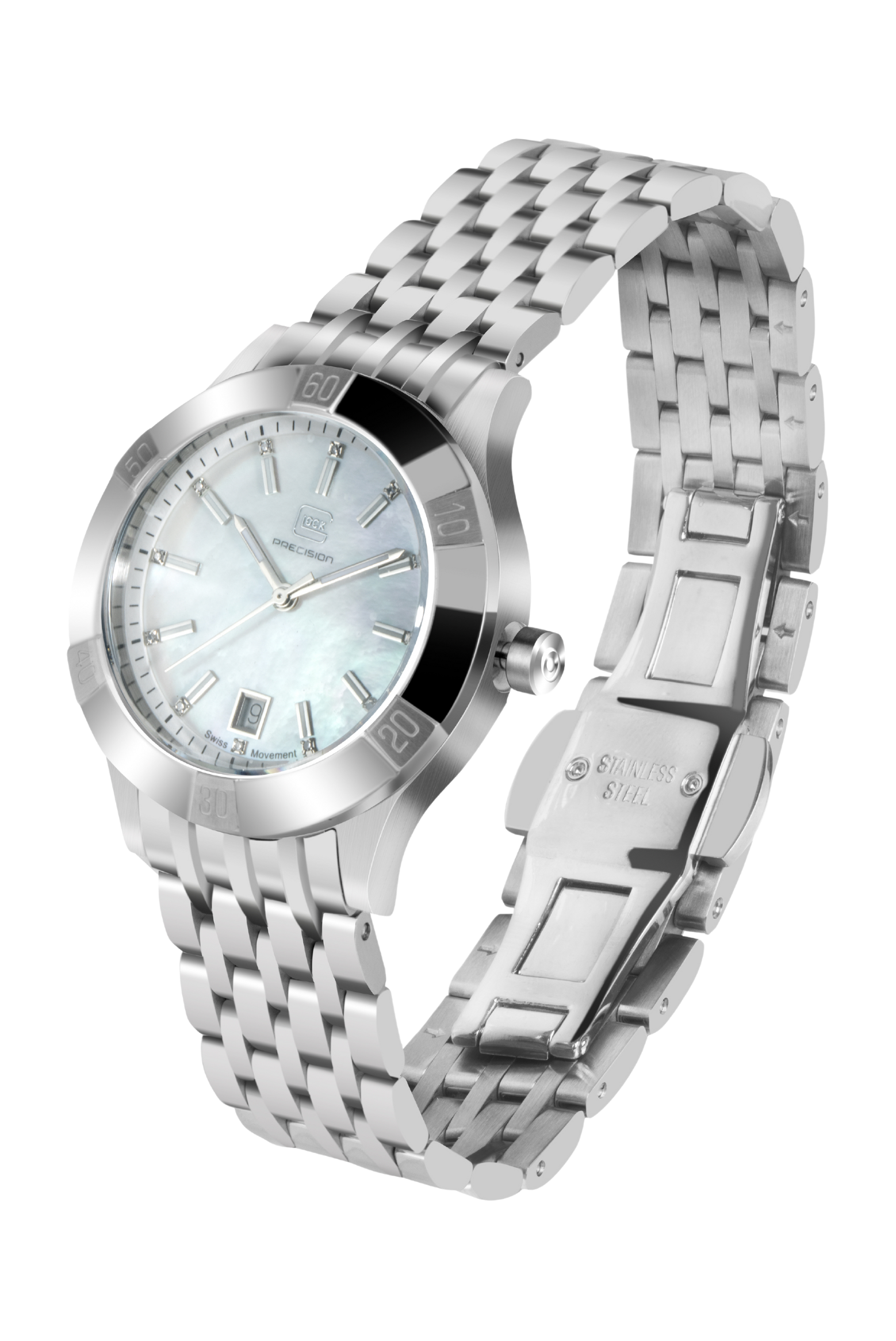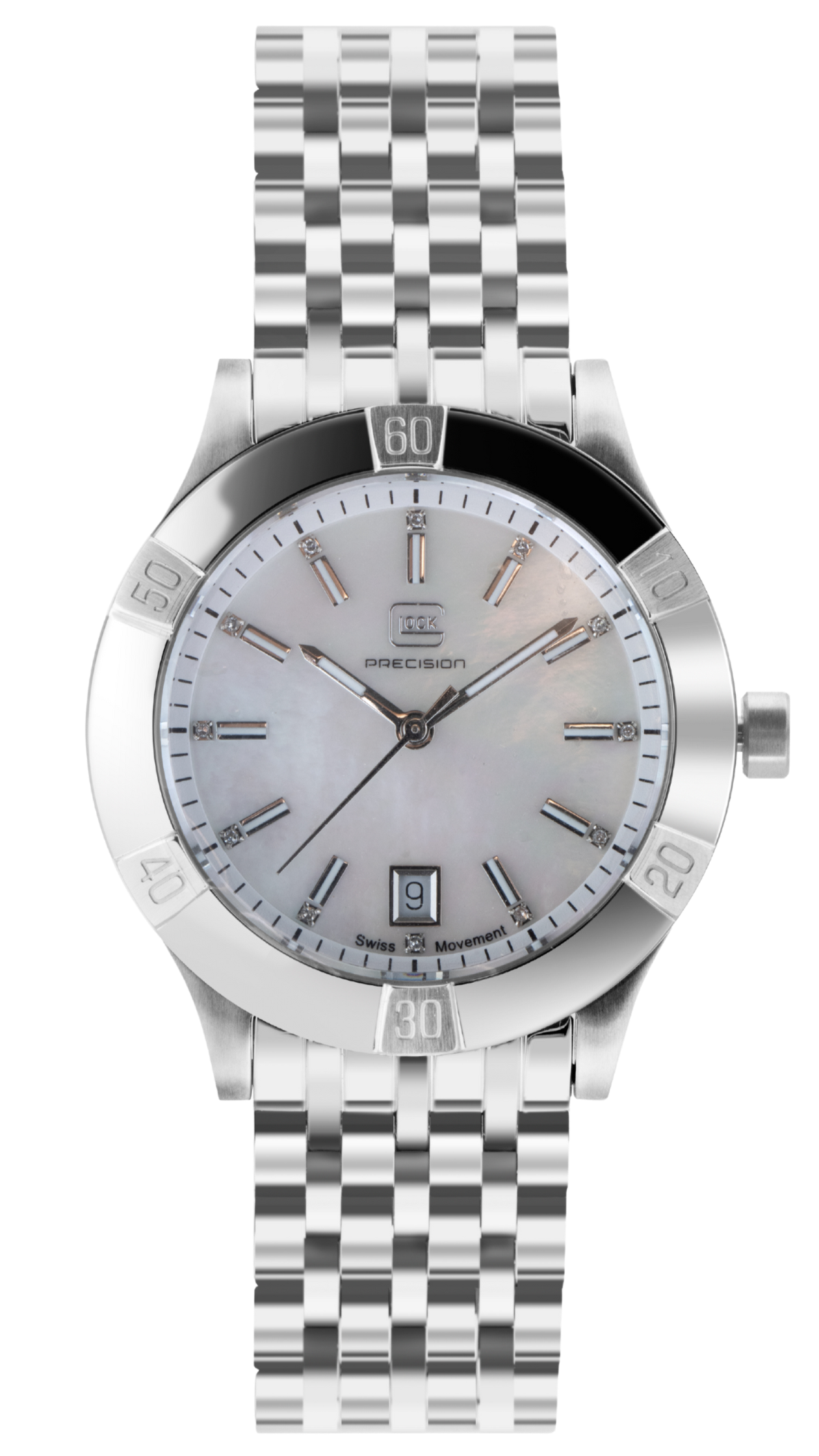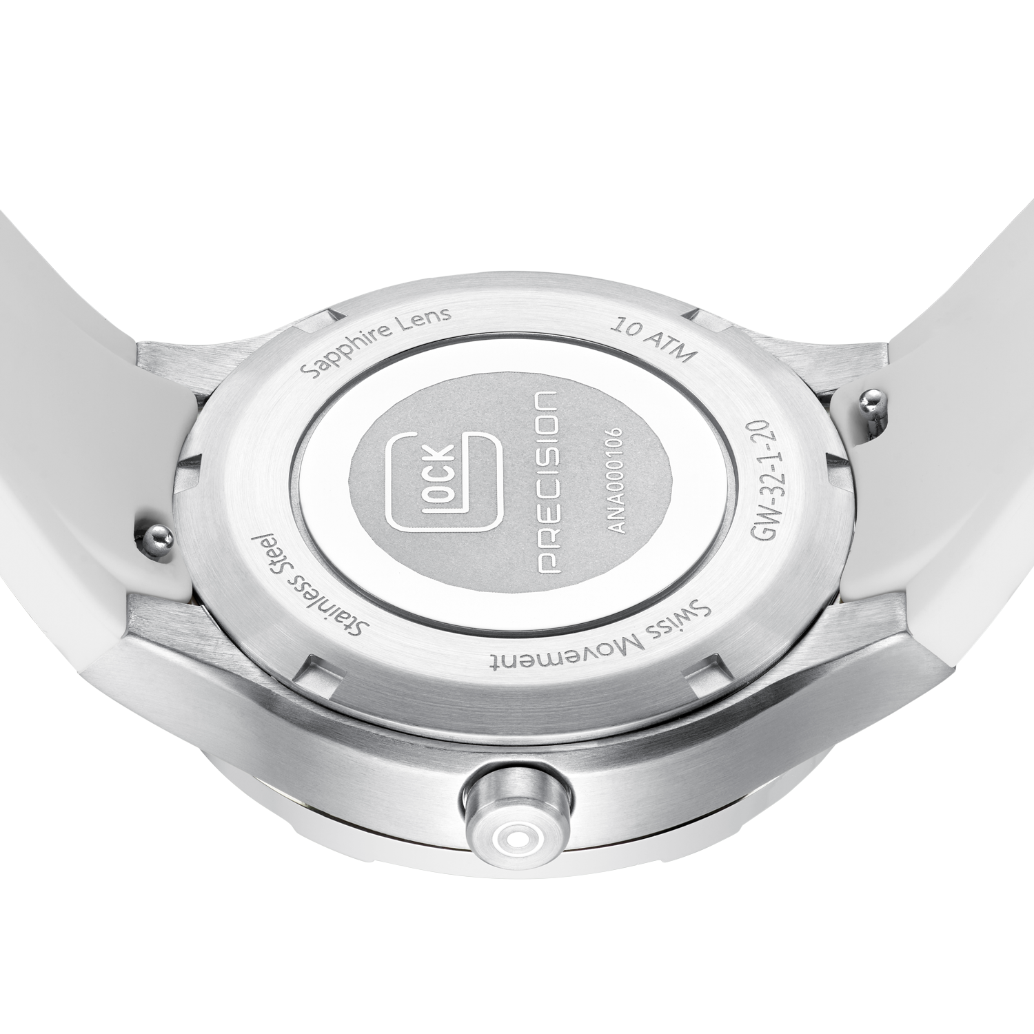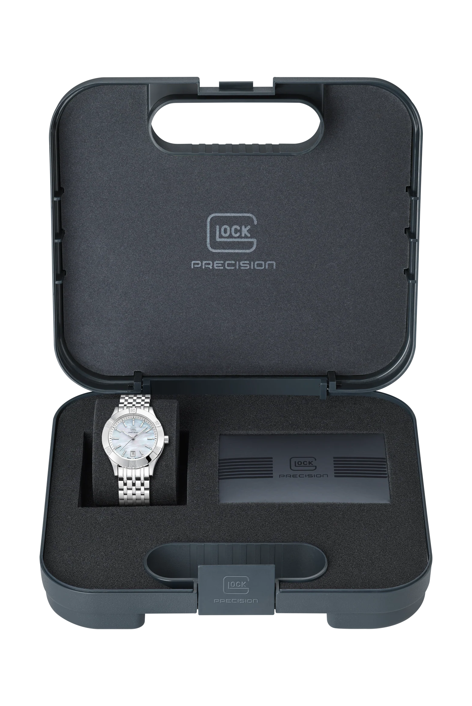 The GLOCK Quartz Model: GW-31-3-18 features genuine diamonds on a mother of pearl dial under a scratch resistant sapphire crystal. The 36mm brushed stainless steel case has polished notched uni-directional bezel with etched number indicators. Luminous pencil shaped hands are surrounded by applied stick indices and twelve real diamond marker. Equipped with a minutes track on outside chapter ring with date window centrally located @6 for precision timing. The steel crown has GLOCK cartridge primer image etched in white with 100 meter water resistance rating. Fitted with a stainless steel 5-link bracelet with GLOCK logo twin push button pressed deployant clasp to secure in place.