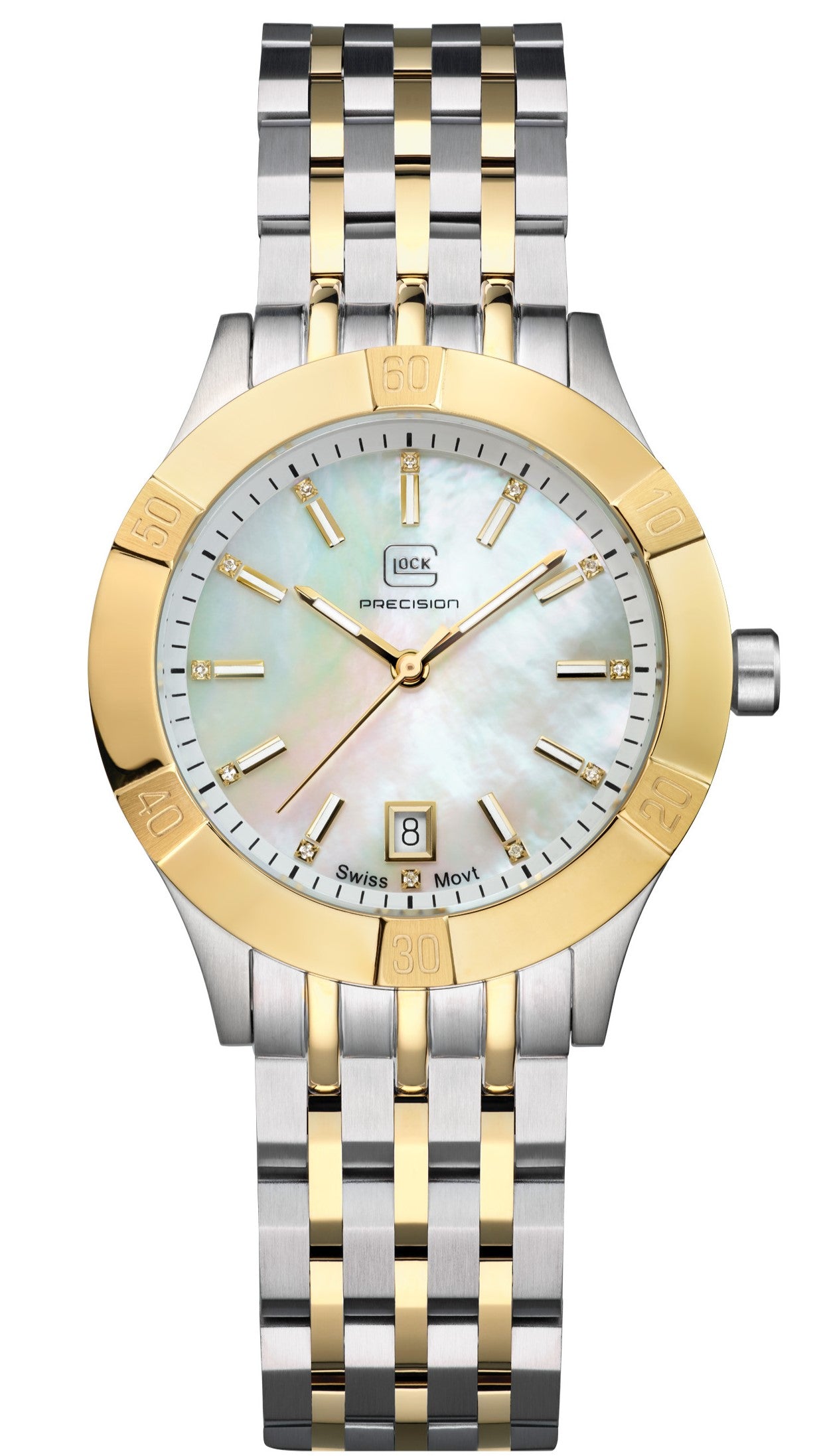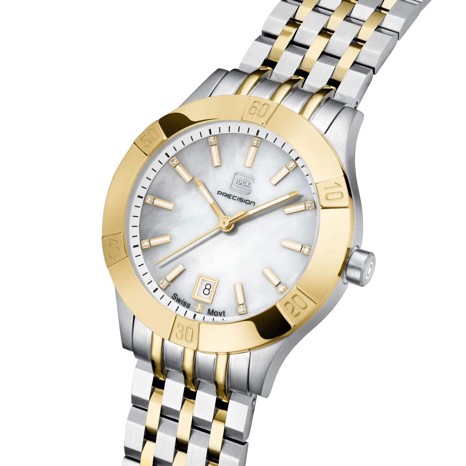 The GLOCK Quartz Model: GW-31-1-18 features genuine diamonds on a mother of pearl dial under a scratch resistant sapphire crystal. The 36mm two-tone brushed stainless steel case has polished notched rose-tone PVD coated uni-directional bezel with etched number indicators. Luminous pencil shaped hands are surrounded by applied stick indices and twelve real diamond marker. Equipped with a minutes track on outside chapter ring with date window centrally located @6 for precision timing. The steel crown has GLOCK cartridge primer image etched in white with 100 meter water resistance rating. Fitted with two-tone PVD coated stainless steel 5-link bracelet with GLOCK logo twin push button pressed deployant clasp to secure in place.