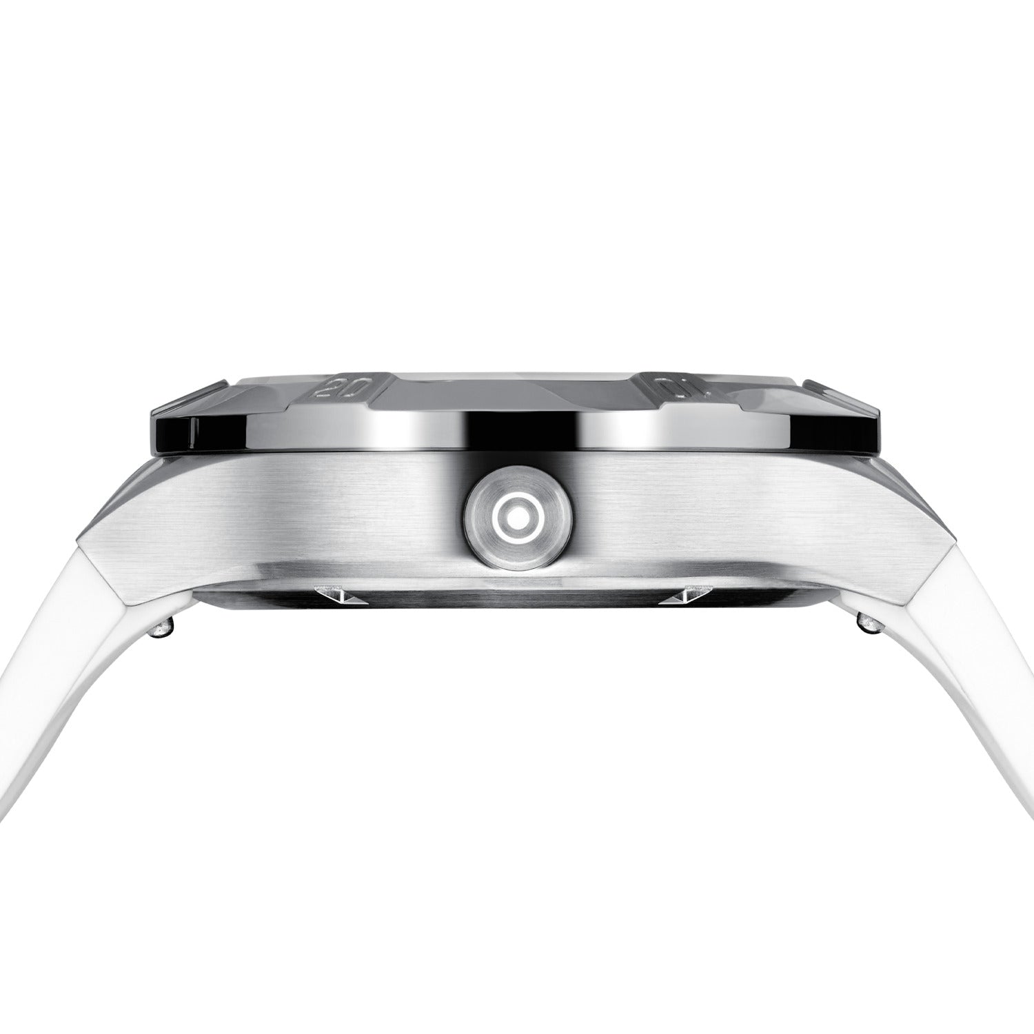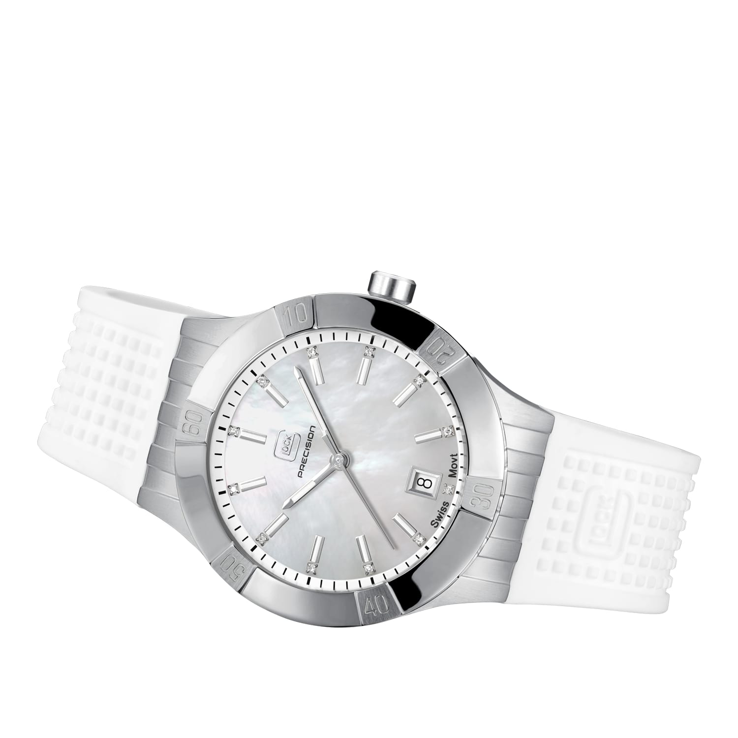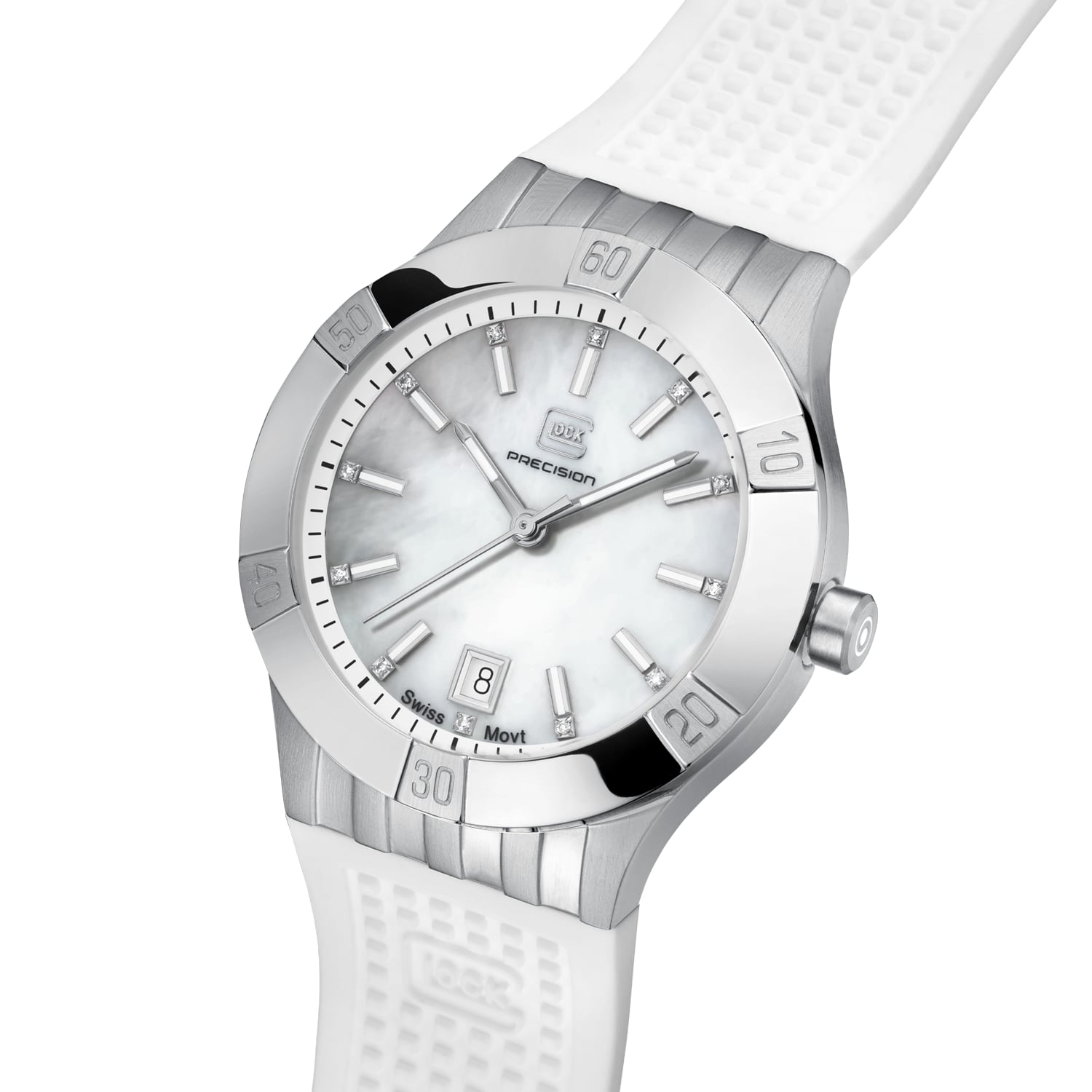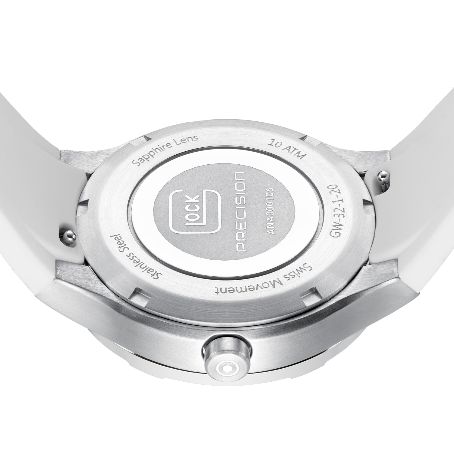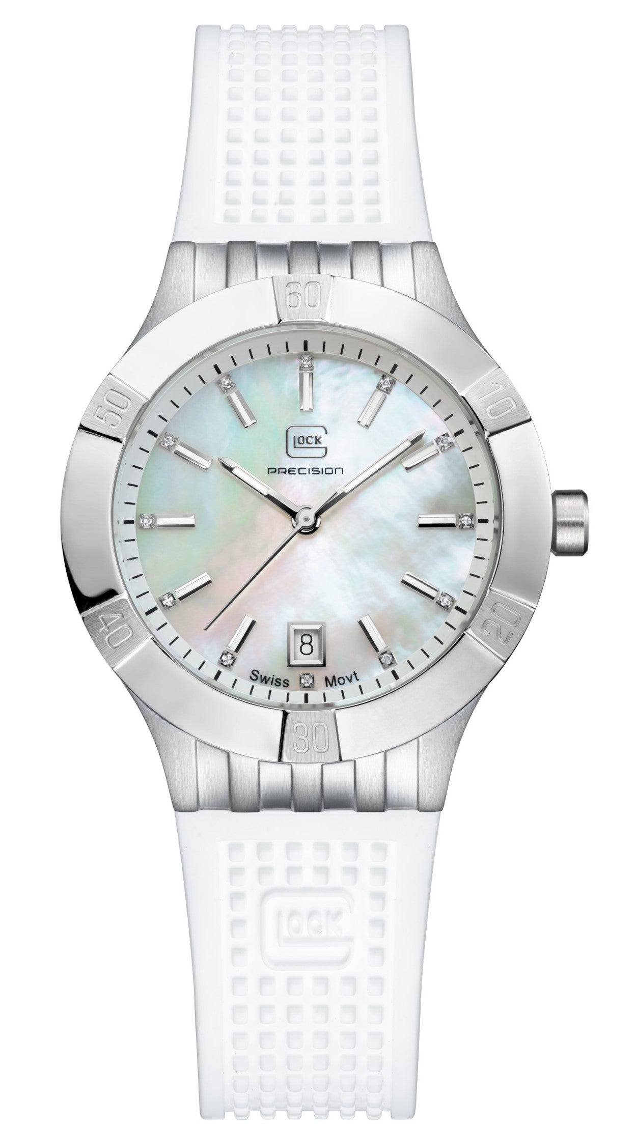 The GLOCK Quartz Model: GW-32-1-20 features genuine diamonds on a mother of pearl dial under a scratch resistant sapphire crystal. The 36mm brushed stainless steel case has polished notched uni-directional bezel with etched number indicators. Luminous pencil shaped hands are surrounded by applied stick indices and twelve real diamond marker. Equipped with a minutes track on outside chapter ring with date window centrally located @6 for precision timing. The steel crown has GLOCK cartridge primer image etched in white with 100 meter water resistance rating. Fitted with a white GLOCK RTF textured pattern rubber silicone strap with steel pressed bi-fold deployant clasp to secure in place.