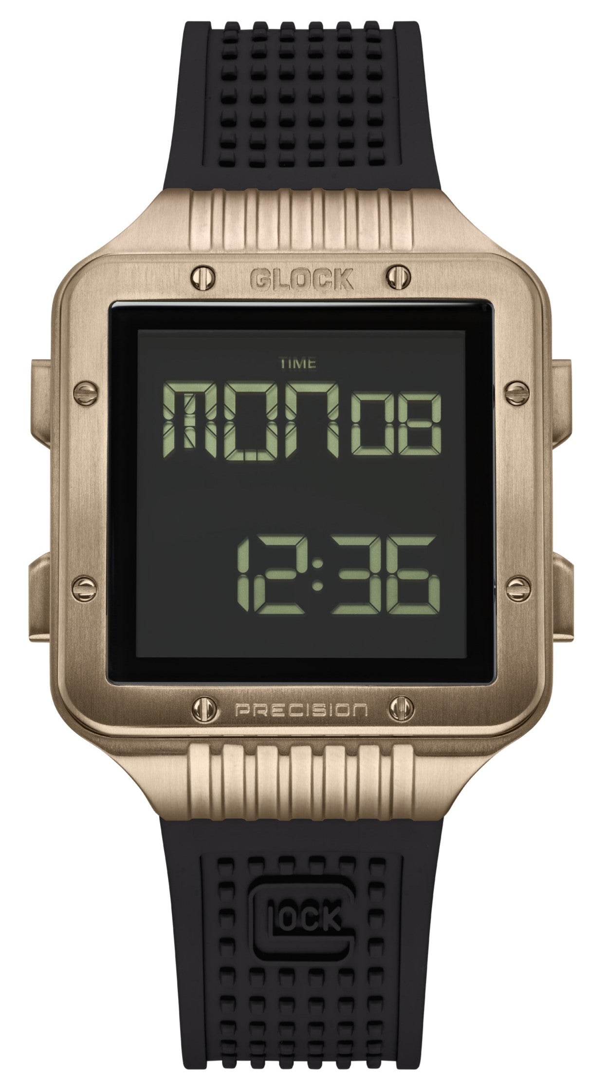 The GLOCK quartz digital timepiece, Model: GW-23-2-22 displays 24-hr time, day/date, alarm and stopwatch function on an LCD screen for your convenience. The 49.5 x 38.5mm rose-tone PVD coated steel case features eight screw top accents on the cushion shaped bezel with contoured ridged lugs. Equipped with oblong chronograph pushers, scratch resistant sapphire crystal and 100 meter water resistance rating. Fitted with a black GLOCK RTF textured pattern rubber silicone strap with rose-tone PVD coated steel pressed bi-fold deployant clasp to secure in place.