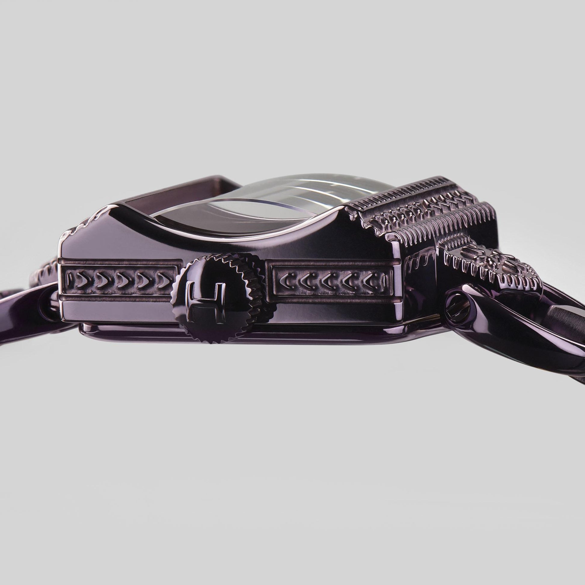 Case Material Eggplant black PVD coated stainless steel rectangular case with embellished decorative bezel
