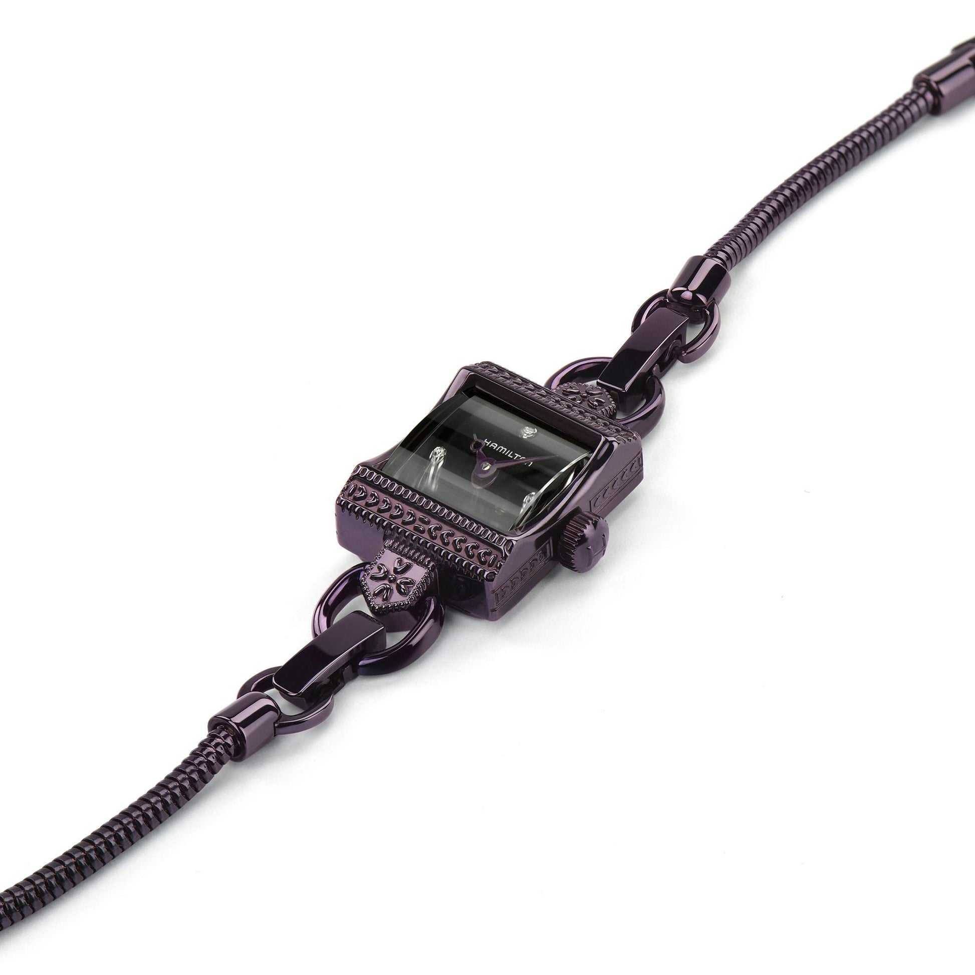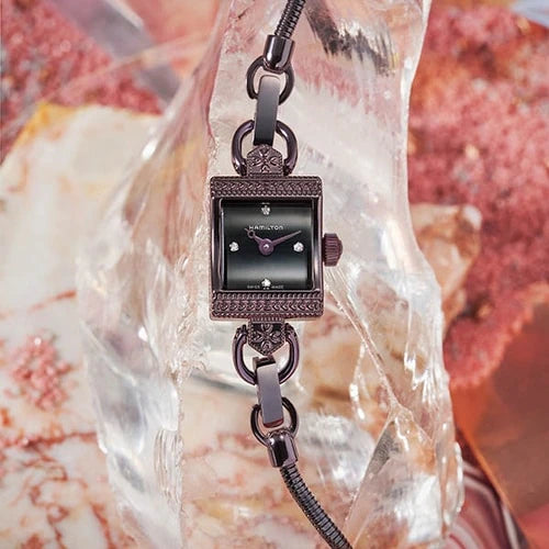 The American Classic Collection was pioneered for Hollywood's stars seen on screen by the HAMILTON brand with signature styles and timeless designs. HAMILTON collaborates with Emmy Award winning costume designer Janie Bryant (featured works in Mad Men, Deadwood) to transform the Lady Hamilton wrist watch into two versions of the charming classic 1950s style for modern fashion of today. The quartz model #H31201130 has a polished eggplant black PVD coated stainless steel decorative rectangular shaped case with a curved sapphire crystal. The black dial has a decorative circular open tipped hours hand surrounded by four genuine diamond markers. Finished with an eggplant black corded stainless steel vintage style bracelet with twin push button bi-fold deployant clasp with Hamilton emblem.