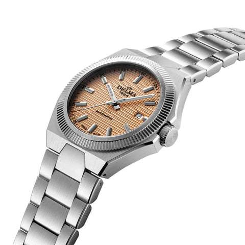 Meeting the demands of the modern wearer, DELMA's Midland Collection is inspired by a look back in time with bold geometric shapes incorporating a new integrated bracelet. Midland was one of the initial four brands used by DELMA’s founder in the 1920’s and also takes its namesake from a model in the 1980’s. The 40.5mm brushed stainless steel tonneau shaped case with a polished fixed fluted bezel encase a salmon guilloche pyramid pattern dial. Applied Super-LumiNova indices  with date window @3 sit behind an anti-reflective sapphire crystal. Luminous baton shaped hands with red tipped central seconds are surrounded by a minutes track. Fitted with a polished and brushed integrated stainless steel 3-link bracelet with security fold-over push button deployment clasp to secure in place.