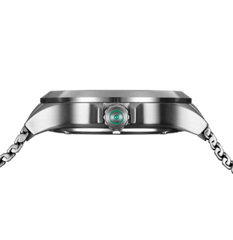 • Emerald green sun-brushed dial with horizontal serration pattern