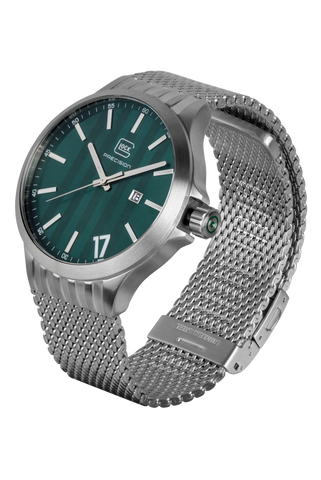 The GLOCK Quartz Model: GW-12-3-24 timepiece features a sun-brushed emerald green horizontal serration pattern dial. The sandblasted steel 44mm case has contoured ridged lugs. Luminous pencil shaped hands are surrounded by a 60-minutes under a scratch resistant sapphire crystal. Equipped with a date window @3 and luminous stick markers with oversize accent Arabic numeral "17" referencing a signature glock gun. An easy grip push-pull crown has GLOCK cartridge primer image etched in green between protective crown guards. Fitted with a steel metal mesh strap with pressed bi-fold deployant clasp to secure in place.