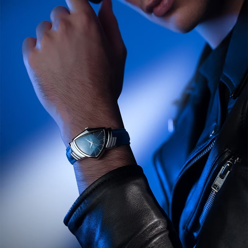 Daring, pioneering and unconventional in design, the Ventura is one of Finished with a gold-tone stainless stretch bi-fold bracelet signed with Hamilton logo. the most iconic Hamilton watches. The world’s first electric watch looks just as good today as it did in 1957. Triangular watches are unusual: the Ventura made them famous watches. With vintage style and charm as well as the enduring legacy of being the Elvis watch, this distinctive treasure is pure Hamilton.