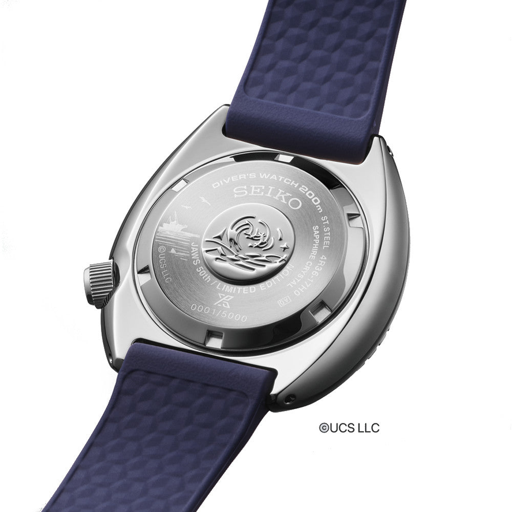 The PROSPEX Collection, a cult favorite among watch enthusiast from all over the world combines durability with sporty style. SEIKO celebrated the 50 year anniversary of the mega-box-office movie release "Jaws" with a commemorative limited edition timepiece featuring the famous shark with just 5000 produced.  The SRPL81 automatic dive watch features a pressed pattern image from the famous move and Jaws logo center front. The 45mm brushed and polished stainless steel case has a bi-colored blue and silver dial surrounded by a blue minutes track. The blue ceramic rotating uni-directional 120 click elapsed timing bezel is well suited for professional diving with a 200 meter water resistance. Equipped with a magnified double day/date window @3 and luminous hands, markers and appendages makes this wrist watch easily readable in any environment. The screw-down crown is strategically positioned at 4:00 for increased comfort and provides added security against moisture and dirt intrusion. Powered by Seiko's own in-house-made automatic caliber 4R36 movement with a 41 hour power reserve. Fitted with a comfort fit blue textured silicone rubberized strap with tang buckle and stainless steel metal safety keeper to keep your watch secure and in place. This piece comes with a specialty box and cushion, signed and numbered  with embossed movie image scene on the case-back.