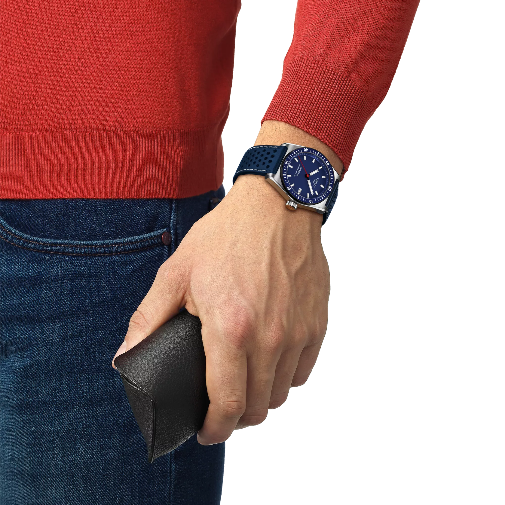 Bracelet/Strap Blue perforated calf-skin leather racing strap with white contrasting stitch