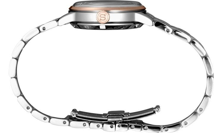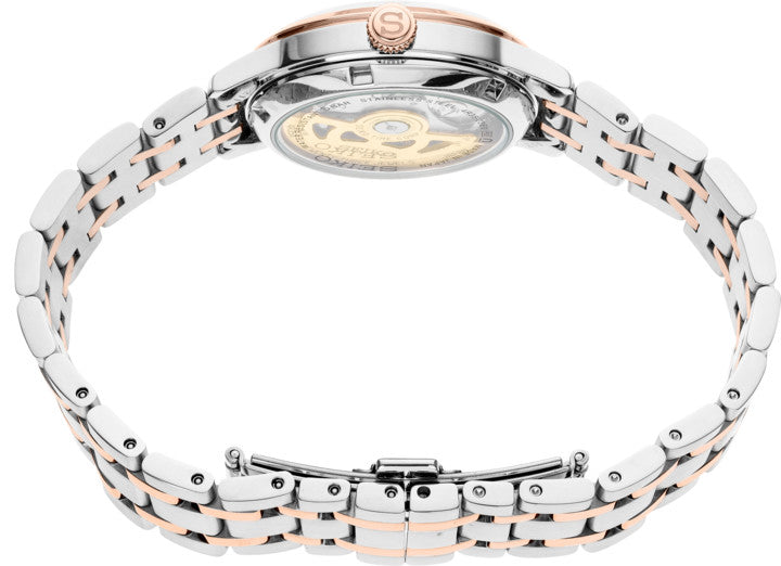 The Presage Collection by SEIKO combines mechanical excellence with sleek svelte design. Inspired by the glamorous jet-set cocktail bars of Tokyo with slim polished markers and delicate curved hands reminiscent of a martini glass. The ladies SRPF54 is a U.S exclusive piece, featuring a shimmering glossy ice pink pressed sunray patterned dial inspired by the pink champagne cocktail behind a boxed shaped hardlex crystal. The 33.8mm polished rose-gold PVD coated stainless steel case is powered by SEIKO's own 4R35 caliber movement with a see-through exhibition case-back and 41 hour power reserve. The faceted polished diamond shaped markers with razor sharp sword style hands are surrounded by a minutes track. Fitted with a polished easy-grip stainless steel crown with 50 meter water resistance rating.  Brushed and polished two-tone twin ribbon rose-gold PVD coated stainless steel bracelet with twin push button tri-fold clasp closure will keep your timepiece secure.