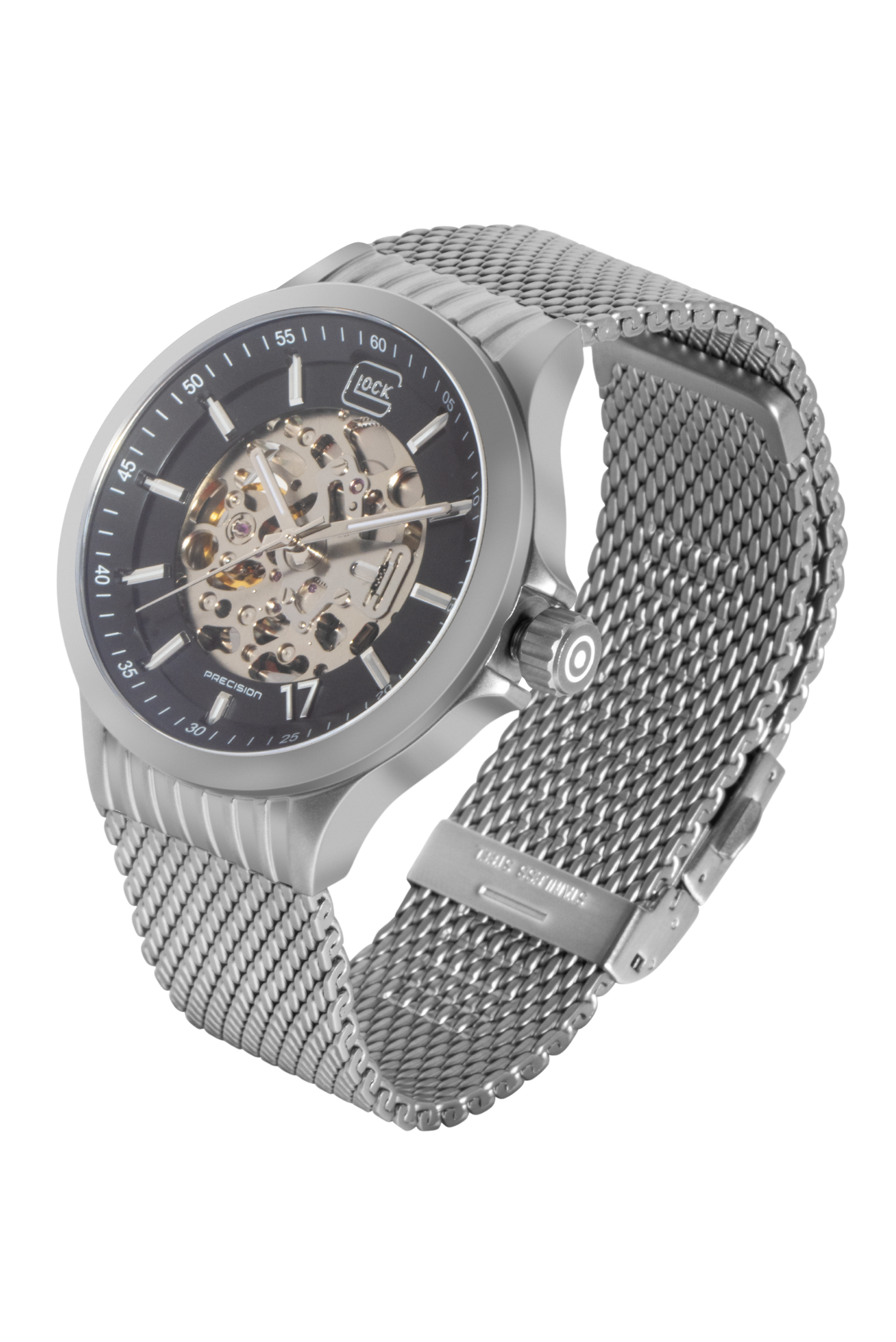 The GLOCK Skeleton Open-heart Automatic Model: GW-14-4-24 features a dial that displays the Swiss movement inner workings of the watch on both the dial front and the exhibition case-back.  The brushed sandblasted 44mm steel case has contoured ridged lugs and circular open-heart cut-out within the black satin dial. Silver Super-Luminova® baton shaped hands and applied indices are surrounded by a beveled minutes track viewable behind a scratch resistant sapphire crystal. The screw down crown has GLOCK cartridge primer image etched in white between a protective crown guard to combat dirt intrusion.  Fitted with metal mesh band and brushed steel pressed bi-fold deployant clasp with etch GLOCK logo to secure in place.