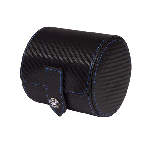 The Carbon Series by the RAPPORT of London brand is a sporty modern collection of watch rolls and cases with colorful contrasting stitch.  Compact, easily fitting into luggage and carry-on bags, the single watch roll makes it ideal storage and protection for your timepiece during travel. Composed of a glossy black carbon fiber exterior shell with contrasting vivid blue stitch and durable tab with polished chrome snap button closure to secure your items in place. The interior has a removable compressible cushion roll lined in a soft velour finish to keep your watches protected and scratch free.