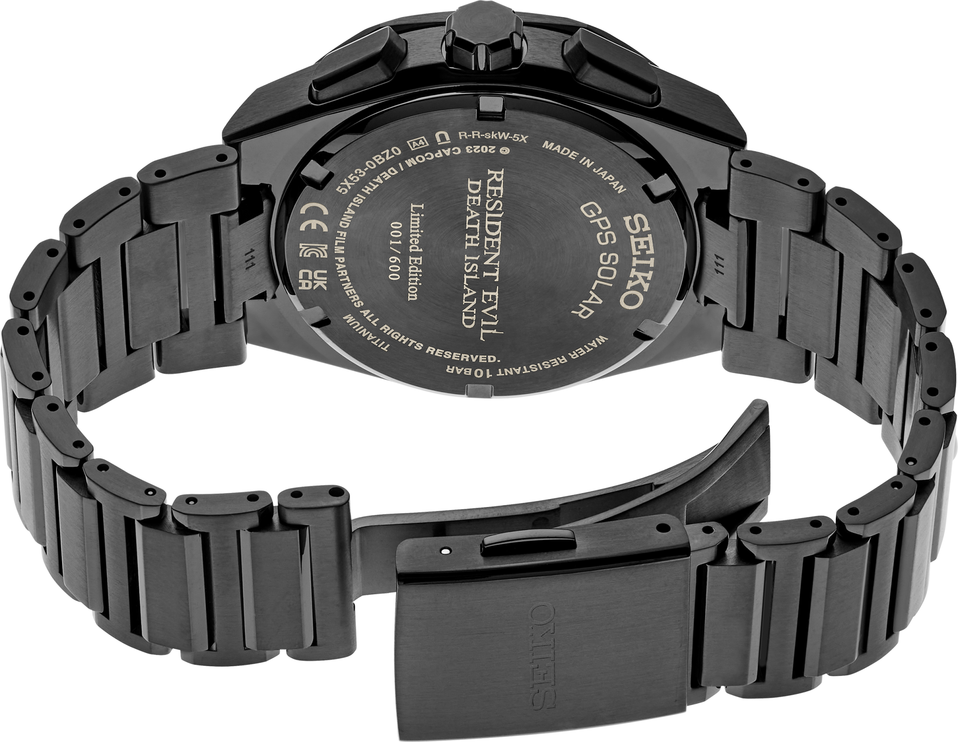 Part of the X5 Titanium series, the SSH129 is a special limited edition timepiece in collaboration with the Resident Evil franchise. Paying tribute and created specifically to appear and be worn by the popular character, Chris Redfield in the upcoming CG animated film is limited to just 600 pieces. The 42.7mm case is composed of super light-weight hard coated durable black ion finished titanium with UTC time-zone display codes on the angular shaped bezel. Equipped with multi-complications featuring automatic hands adjustment, perpetual calendar, daylight savings, world time and dual time functions. The flecked vintage textured olive green dial has special blue-glowing luminous baton style hands and raised markers behind a dual curved super-clear coated anti-reflective sapphire crystal. The date window is nestled between the 4 and 5 with day display sub-dial @3 and am/pm small indicator function for a clean look. The dual time-transfer sub-dial is located @ the 6 with flight mode, DTS, leap year and power reserve indicator wheel @9. The polished black coated push-pull crown has a water resistance rating of 100 meters with polished pushers that can adjust and switch between the main dial and sub dial for convenience comparing in-flight time zones. Your watch is secured with a twin push button bi-fold safety clasp on a polished and brushed black ion finished lightweight titanium bracelet featuring the embossed Seiko insignia.