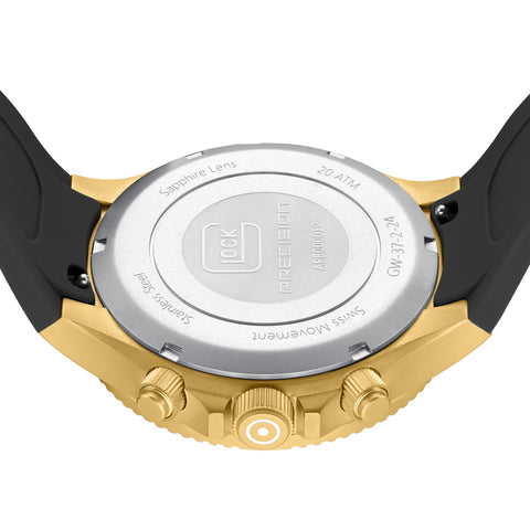 3The GLOCK Chronograph Quartz Model: GW-37-2-24 features an emerald green sun-brushed dial surrounded by gold-tone luminous indices and minutes marker track. The yellow PVD coated 44mm steel case has contoured ridged lugs with a quarter nail-head accented uni-directional bezel.  Luminous gold-tone baton shaped hands with slanted date window are easily viewable behind a scratch resistant sapphire crystal. Equipped with gold-tone sub-seconds, 30-minute, and 12-hour counter for precision timing. The screw down crown has GLOCK cartridge primer image etched in white between gold-tone PVD coated steel ridged chronograph pushers and protective crown guard. Fitted with a black rubber silicone strap with raised GLOCK lettering and steel PVD coated pressed bi-fold deployant clasp to secure in place.