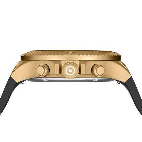 • Brushed gold-tone PVD coated ridged chronograph pushers